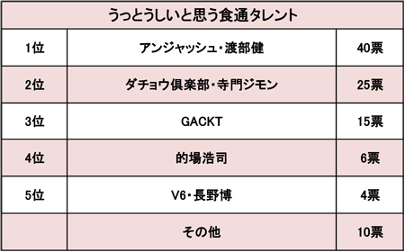 サイゾーウーマン芸能男性タレントうっとうしい食通タレントランキング 芸能 サイゾーウーマン世論調査 「渡部は食べログに振り回されてる」「ジモンは肉バカ」うっとうしい食通タレントランキング 2016/11/26 17:00 芸能ウラ情報ランキング男性タレント テレビや雑誌などのグルメ特集に登場し、隠れた名店や、食のうんちくについて熱弁をふるっている“食通タレント”。中には、ツウぶっている様子や、グルメへの熱が強すぎて、苦手と感じてしまうタレントもいるのではないだろうか。そこで今回は男女100名にアンケートを行い、「うっとうしいと思う食通タレントランキング」を調査した。(Sagooooワークス調べ/調査地域:全国/調査対象:年齢不問・男女/有効回答数:100) 佐々木希と付き合ってるんだから別に何言われようがいいよね 40票という圧倒的な票数を集めて第1位の座についたのは、お笑いコンビ・アンジャッシュの渡部建。年間500軒以上もの店を訪れているという芸能界きっての食通タレントで、テレビのグルメ番組では常連となっているが、 「しゃべり方で腹が立ち、全て嘘っぽく聞こえる」(30代/女性/専業主婦) 「本当にわかっているのか、そもそも疑問に感じる。ビジネス臭がすごい」(30代/女性/会社員) 「年間500軒以上のお店を食べ歩いたというエピソードが、どこかうさんくさいから」(60代/女性/専業主婦) 「本当に食通なのか怪しいコメントをすることがあるので」(30代/女性/無職) と、そもそも本当に食通なのか疑ってしまうという声が続出している。さらに「渡部建の態度を見ているとうっとうしく、話を聞いていると何様だと思う」(30代/女性/無職)「食レポに自信を持っているからか、いつも偉そうに感じる」(20代/女性/専業主婦)「偉そうな態度でしゃべっているけれど、教養がないのか、言葉の間違いがすごく多い」(20代/女性/学生)など、渡部自身の言動に嫌気が差しているという意見も多く見られた。 そのほか、「食べログの評価に振り回されすぎていて、面白くない。特に話がうまいわけでもないですし、見る価値がありません」(40代/男性/会社員)「明らかに“ビジネス食通”。食べログなど、外部の情報を集めているだけで、本人に確かな味覚があるように思えない」(20代/女性/専業主婦)「食べログの評価を気にしていて、そもそもいきなり食通で売り出し始めたので、本当に食通とは思えない」(20代/女性/専業主婦)など、“食べログ芸人”的な扱いをする人も多いようだ。 続いて第2位には、同じくお笑い芸人のダチョウ倶楽部・寺門ジモンが25票を獲得しランクイン。「家畜商」の免許まで取得し、松坂牛を個人的に競り落とすほどの肉好きで知られる寺門には、 「お肉に対する情熱が熱すぎて、ついていけない。思わずチャンネルを変えてしまいます」(30代/女性/会社員) 「食通というより、“肉バカタレント”でしょうね。肉嫌いに対してはうるさい。勘弁して」(50代/男性/無職) 「肉のことばかりで全然面白くないし、態度がうっとうしいと思う」(40代/女性/専業主婦) 「寺門さんはお肉にうるさいというイメージが強すぎて苦手な方です」(30代/女性/パート・アルバイト) といった声が集まった。また、肉へのこだわりをとことん貫くその姿勢には、「知識がありお店の人から信頼されていることもわかるけど、5分も見ていると、そのうんちくもうっとうしくなる」(30代/女性/専業主婦)「確かに人並み以上の知識や情熱を持っているんだと思うけど、見ていて『うっとうしい』そのまま」(40代/男性/パート・アルバイト)など、もはや暑苦しいレベルのうっとうしさだと評されている。 そして第3位に選ばれたのは、15票を集めたGACKT。最近では、ミステリアスなキャラクターだけでなく、芸能界随一の食通としても知られるGACKTだが、 「金銭感覚が一般人と違いすぎる。リアクションが薄いので味があまり伝わってこない」(20代/男性/会社員) 「服装や生活スタイルなどが一般の人とは次元が異なるような気がして、リポートをしても共感を持ちにくい」(40代/男性/その他専門職) 「この男の怪しさは最強であります。グルメ以前の問題があります」(40代/男性/自営業) 「アーティスト・GACKTに、そもそも『食通タレント』という肩書が似合わない」(50代/女性/パート・アルバイト) と、もともとのキャラクターと食通のギャップを受け入れられないという人が多いようだ。また、炭水化物の摂取を控える“糖質制限ダイエット”を行っていることから、「糖質制限で白米も食べないと言っているのに、そんなやつに食が語れるのかと思う」(40代/女性/パート・アルバイト)という声も。 また、6票を獲得して第4位になった的場浩司には、「俳優業に専念してほしい。タレント業はあまりしてほしくない」(40代/女性/自由業・フリーランス)と、俳優が食通タレントとして露出することに反発の声が上がった。 続く第5位に輝いたのは、4票を集めたV6・長野博。こちらは「うっとうしいというより、食通のイメー