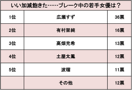 サイゾーウーマン芸能女性タレントいい加減飽きた若手女優ランキング 芸能 サイゾーウーマン世論調査 「広瀬すずは性格が悪い」「高畑充希は魅力ナシ」“いい加減飽きた”若手ブレーク女優ランキング 2016/12/24 15:00 女性タレント芸能ウラ情報ランキング 秋ドラマ『IQ246~華麗なる事件簿~』(TBS系)で刑事役を務める土屋太鳳や、今年1月期の月9ドラマ『いつかこの恋を思い出してきっと泣いてしまう』(フジテレビ系)で主演を務めた有村架純など、ドラマ界を席巻する若手女優たち。中には、ほとんどテレビに出ずっぱりの人気女優も少なくないが、彼女たちはお茶の間ではどんなふうに評価されているのだろうか? それを調べるため、今回は「いい加減飽きてしまった、ブレーク中の若手女優は?」というアンケートを男女100名に実施した。(Sagooooワークス調べ/調査地域:全国/調査対象:年齢不問・男女/有効回答数:100) 『四月は君の嘘』公式サイトより 第1位に選ばれたのは、36票を獲得した広瀬すず。モデル出身ながら、映画『海街diary』や『ちはやふる』シリーズなどに主演し、2016年9月には『四月は君の嘘』で山崎賢人とW主演を務め、話題に。順調に女優としてのキャリアを積んでいる広瀬には、 「クイズ番組で、すごいお馬鹿っぷりを披露していて幻滅したから。ほかにも時々、周囲への配慮が足りないと思う発言が多く、見ていて不快なので」(30代/女性/専業主婦) 「馬鹿な発言や、気遣いのない言動を見聞きしていると、ちやほやされているのが当たり前になっているのかなと思ってしまうので」(40代/男性/会社員) 「性格の悪さを隠しきれていないところと、わざとらしいぶりっ子が苦手です」(30代/女性/パート・アルバイト) 「バラエティなどで配慮のない発言をし、問題視されているので。まだ若いので本業のモデルに力をいれつつ、お芝居などを勉強する時間をもらってもいいのではないでしょうか」(40代/女性/専業主婦) 「かわいいのですが、少し前に裏方さんを馬鹿にした発言があり、やはり裏方さんを大切にできる女優さんになってほしいからです」(50代/男性/会社員) といった声が多く上がった。昨年、『とんねるずみなさんのおかげでした』(同)において、照明や音声のスタッフを蔑視する発言をしたことで、好感度を暴落させてしまったようだ。さらに「トークが面白くないし、まだまだ経験不足を否めない。清純派で売るのはいいが、多少の面白トークも必要」(40代/男性/会社員)「話も面白くないですし、最近かわいさが薄まってきたような気がするので」(30代/女性/会社員)と、トーク力のなさも評価を下げている原因のようだ。 また、肝心の女優業については「どのドラマや映画を見ても『広瀬すず』にしか見えない。役柄が見えてこない」(30代/女性/自由業・フリーランス)「CMにドラマに映画に、たくさん出ているがどれも同じようなキャラと演技でいい加減見飽きた」(20代/女性/専業主婦)「顔はすごくかわいいので、CMで見るのはいいと思うのですが、演技はいつ見ても同じで、つまらないと感じてしまいます」(30代/男性/自営業)など、演技に幅がないという指摘をする人が多かった。 続いて16票を集め、第2位に輝いたのは有村架純。17年4月放送開始予定の朝ドラ『ひよっこ』(NHK総合)の主演を務めることも決定しているなど、順風満帆の活動を続けているが、 「いつもドラマや映画の番宣でテレビに出ていて見飽きた」(30代/女性/専業主婦) 「ドラマや映画に出すぎている感じがあり、もう見たくないと思うようになってきた」(30代/男性/会社員) 「CMにしてもドラマにしても出すぎている感がものすごくあるし、かわいさが図々しくみえるから」(40代/女性/パート・アルバイト) 「有村架純さんは『阪急電車』以来すごく露出が増えていますね、飽きるほど」(30代/男性/会社員) 「テレビドラマや映画のみでなく、バラエティ番組にもたくさん出ていて飽きました」(30代/男性/自営業) と、単純にメディア露出の多さから見飽きたという声が目立っている。また、その演技力に関して疑問を呈する人が多く、「すごくかわいいし、パッと華やかさを振りまくオーラがあるけれど、何を演じても有村架純のままだからです。ブラッシュアップを期待したい」(40代/女性/専業主婦)「ドラマにも映画にも頻繁に出ているわりに特別演技がうまいとは感じず、どれも同じように見えるから」(20代/女性/学生)「ドラマ、映画、CMに引っ張りだこで、見る機会が頻繁にあるせいか、どの役柄を演じていても同じ表情、同じ話し方で固定されている気がするから」(40代/女性/その他専門職)といった声が上がっている。 そして第3位には13票を集めた高畑充希がランクイン。高畑といえば『植物図鑑 運命の恋、ひろいました』で映画初主演、16年度上半期の朝ドラ『とと姉ちゃん』(NHK)でも主演を務めるなど、16年最も注目を集めた女優の1人。しかし「CMではよく見るが、特徴がなく、どこが魅力かわからない」(20代/男性/会社員)「特に