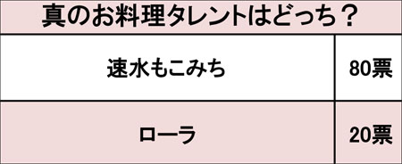 対して「ローラ」は20票で、もこみちとは大差の結果に。ただ、「期待値が低かったことと、キャラとのギャップで好印象」(38歳/女性)「ローラが料理をするだけで感激。料理をするイメージがないから」(50歳/女性)と、「普段の奔放キャラクターと料理にギャップがあり、話題性がある」(34歳/女性)と感じた人は少なくないようだ。