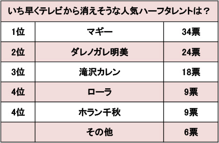 ドラマからバラエティまでマルチに活躍し、テレビで見かけない日はないほど人気のハーフタレントたち。「ハーフ枠」なるものも確立され、次々にハーフ美人が登場しているが、若干飽和気味なのも否めない。そこで、男女100人に「いち早くテレビから消えそうな人気ハーフタレントは?」とのアンケートを行った。(Sagooooワークス調べ/調査地域:全国/調査対象:男女・年齢不問/調査期間:5月10~5月28日/有効回答数:100)