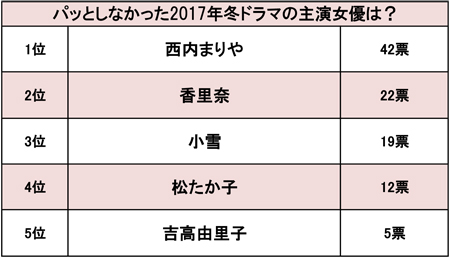 サイゾーウーマン芸能女性タレント上半期パッとしなかった主演女優ランキング 芸能 サイゾーウーマン世論調査 「西内まりやは女優じゃない」2017年上半期“パッとしなかった連ドラ主演女優”ランキング 2017/07/08 15:00 芸能ウラ情報女性タレント さまざまなニュースが芸能界を賑わせた2017年上半期も終了。ドラマ界でも、冬/春ドラマが放送され、主演女優のキャスティングや演技力など、イイ意味でもワルい意味でも期待を裏切った人物が世間の話題をかっさらった。そこで今回は、男女100人に「パッとしなかった2017年春ドラマ/夏ドラマの主演女優は誰ですか?」というアンケートを実施した。(Sagooooワークス調べ/調査地域:全国/調査対象:男女・年齢不問/調査期間:<冬ドラマ>3月16日~3月22日<春ドラマ>6月20日~6月26日/有効回答数:100) 『突然ですが、明日結婚します』(フジテレビ系)公式サイトより 【冬ドラマ編】 42票で1位に躍り出たのは、月9史上ワースト1の視聴率を記録した『突然ですが、明日結婚します』(フジテレビ系)の西内まりや。 「初回を見て、学芸会のような演技にドン引きした。女優とは呼べないような、どのシーンも同じ顔が目についた」(60歳/女性) 「イマイチ演技が不自然な感じでパッとしなかった。役柄の設定と合っていない感じ」(41歳/男性) など、「スタイルが良くて美人だとは思うが、主演女優という感じではない」(26歳/男性)「もともと歌手なのに、なんで女優の仕事を引き受けたのかも謎」(26歳/女性)と思わせるような、「主演にしては周りを引っ張っていく力が不足している」(25歳/女性)と演技力を指摘する声が目立った。 また、「ドラマ自体パッとしない。でも、ほかの女優さんの方が視聴率を取れたのではないかと思う」(39歳/女優)との意見もあることから、内容と主演が、負の相乗効果を生んでしまったのかもしれない。 2位にランクインしたのは、22票を獲得した『嫌われる勇気』(同)の加里奈。圧倒的に多かったのは、「一時期の週刊誌の写真のイメージダウンから、香里奈を魅力的な女性として見ることができなくなった」(33歳/女性)との声だ。 「モデル出身だからか、いつ見ても『香里奈』でしかない。役に入りきれず、中途半端な印象」(28歳/女性)を与えてしまう演技力の低さ、また「ほぼすっぴんに見えるメイクが似合わない。必要以上に幸薄そうに見えた」(28歳/女性)というミスキャスト感を指摘する声も出ていた。 僅差の19票で3位に留まったのが、『大貧乏』(同)の小雪。一文無しになったシングルマザーが奮闘するストーリーだけに、「小雪は大貧乏のキャラじゃない。もっとおしとやかなキャラがよく似合うのにもったいない」(56歳/男性)との印象が強く、「小雪のイメージが強すぎて、ドラマの役に違和感を覚えた」(48歳/女性)視聴者が少なくなかった様子。 また、「昔はきれいだったけど、すっかりおばさん顔になってしまった。年齢より老けて見える。もともと演技力があるわけではないので、見ていてキツイ」(45歳/女性)など、容姿に関する声も上がり、「小雪はデカい。その印象だけでドラマがつまらなくなった」(21歳/女性)との指摘も散見された。 4位は12票で、『カルテット』(TBS系)の松たか子。「内容がミステリアスすぎて、松の魅力を引き出せていなかった」(60歳/女性)「安心して見られる女優の安定感があった。しかし、それ以上のインパクトはない」(70歳/男性)と、松の演技力を支持しながらも苦言を呈する視聴者が多数いた模様。 5位は『東京タラレバ娘』(日本テレビ系)の吉高由里子で、5票。人気マンガが原作とあり、「マンガの主人公とドラマの女優のキャラが、なんとなく合っていなかったように思う」(24歳/女性)「主演とはいえ、誰がやってもいいような役柄だと思う」(31歳/女性)と、吉高本人というより、キャスティング自体に問題ありとする意見もみられた。 次のページ 春ドラマ編 1234次のページ 関連記事 「渡部が浮気をして佐々木を裏切る」男女100名に聞いた「離婚しそうな有名人夫婦」ランキング「板野友美の顎と目は不自然」AKB48で最も“整形していそうなメンバー&OG”ランキング「宮根は人をバカにしてる」「古館は古臭い」実は苦手な“人気男性アナ”ランキング「松潤は王子様ではなく、ただの男だった」最も衝撃的だった“嵐の熱愛スキャンダル”ランキング「AKIRAは一辺倒」「MAKIDAIは大根レベルを超越」演技がヘタだと思うEXILE俳優ランキング
