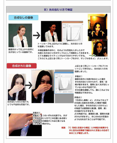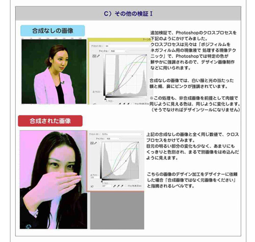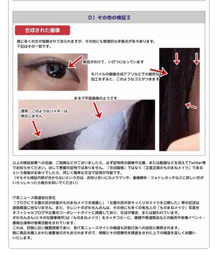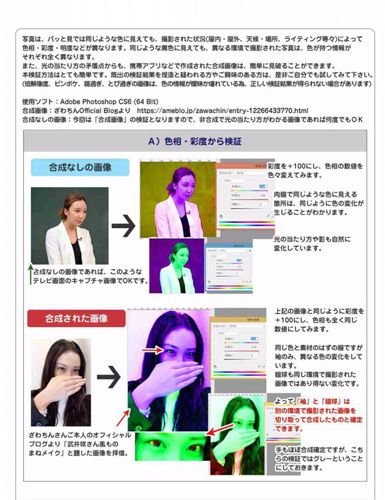サイゾーウーマン芸能女性タレントざわちん「顔ドロボー」疑惑の真実 芸能 ざわちんアンチが一致団結! ざわちん「顔ドロボー」疑惑、プロ画像解析業者による衝撃の結果……アンチ執念の結実 2017/10/27 15:30 芸能ウラ情報 「うそちん」「詐欺ちん」「顔ドロボー」……。これらは今、SNS上で呼ばれている「ざわちん」の呼称だ。由来はほかでもない、彼女の代名詞だった「ものまねメーク」画像が“加工”され、“合成”されているのではないかという「疑惑」からきている。 こうした彼女への誹謗中傷が、単なるひがみでも臆測でもないとする決定的証拠が、最近になって白日の下にさらされた。その証拠は2つあり、それぞれ専門家が分析に関わっている。まずは、1つ目から取り上げていきたい。 ■検証1:画像関連の技術者が独自鑑定「合成は120%黒」 まずは今年3月18日、女性ユーザーが投稿する大手コミュニティサイトにアップされた、この資料画像。ユーザーたちが、「ざわちんのものまねメーク写真は合成ではないか」と議論を交わす中、キャリア15年という画像関連の技術者がSNS上に現れ、独自に調べた検証結果をアップした。それぞれ「色相・彩度」「光の当たり方」など、さまざまな観点からざわちんの画像を解析している。例えば、こんな報告が寄せられている。一部を抜粋しよう。 【1】色相、彩度を検証 ※クリックで拡大表示 【2】光の当たり方を検証 ※クリックで拡大表示 【3】その他の検証 ※クリックで拡大表示 【4】その他の検証 ※クリックで拡大表示 以上の検証は正直なところ、素人にはかなり専門的すぎるきらいがあり、一読しただけでは理解できない。だが、それでも、ざわちんのものまねメークは「合成である」と結論づけているのは容易にわかる。 例えば1にある武井咲の画像。この「眼球」は、別の画像から切り取って合成した、という一文が綴られている。この解析を行った技術者は、武井のみならず、本田翼、坂口健太郎、大島優子、吉高由里子、新垣結衣、綾野剛などの「ものまねメーク」も検証し、いずれも「合成は120%黒」と断定したという。 ユーザーはこの結果に驚きながらも、疑惑が確信に変わったことで、さらに、ざわちんへの不信感を高め、マスコミに記事化を求めたが、技術者が個人名を明かせないこと、またざわちんの、記事としてのバリュー(価値)の低さなどから、どこも取り合ってくれなかったという。 また、この検証を知ったざわちん本人も「一般人の捏造を信じないで」とTwitterのフォロワーに“注意喚起”。結局、うやむやに終わりそうになったという。 次のページ 検証2:解析会社の調査「初見で黒と鑑定」 12次のページ 関連記事 出雲大社で星条旗、ひめゆりの塔で「気持ちよくない」……“常識外れ”ざわちんの危険度ざわちんは、なぜ他人の画像をパクるのか? 「ものまねの影響で罪悪感ない」と臨床心理士談石原さとみ、本田翼、ざわちん……芸能記者の失笑を買った、2016年の珍会見とは?ざわちん、上島との“キス芸”に「中途半端」! 微妙なリアクションで「会見はしらけムード」ざわちん、「鼻整形したい」発言から1カ月……「明らかに違う!」とマスコミ騒然