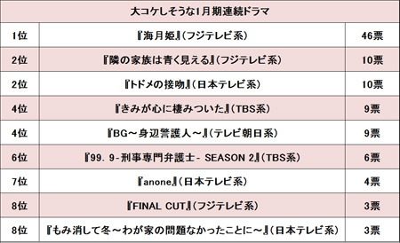 サイゾーウーマン芸能テレビ100名に聞いた新ドラマの大コケ予想 芸能 サイゾーウーマン世論調査 100名に聞いた「1月期ドラマの大コケ予想」、ぶっち切りの1位は月9『海月姫』! 2018/01/10 10:00 テレビ芸能ウラ情報 順次スタートし始めた2018年1月期の冬ドラマ。ネット上は「どのドラマが面白いか?」と盛んに話題となっているが、一方で「キャストが地味」「ストーリーがパッとしなさそう」などと、残念な方向で注目を集めているドラマも。そこで今回は、男女100人に「大コケしそうな1月期連続ドラマ」を予想してもらった。 『海月姫』(フジテレビ系)公式サイトより 46票と半数近い票が集まり、1位となったのは、芳根京子主演『海月姫』(フジテレビ系、月曜午後9時)。 2014年に能年玲奈(現・のん)主演で実写映画化されている漫画原作のストーリーだけに、「すでにある程度わかっているものを、もう一度ドラマで見たい方がどれぐらいいるかと考えると、コケそうな気がする」(40代/女性)「人気漫画の実写化だが、原作ファンを納得させるクオリティのものが作れるとは思えない」(20代/女性)と、懸念を抱く声が。また「映画で“のん”がやったイメージが強い。“のん”の演技はとてもうまいので、それを思うとコケそうな気がする」(40代/女性)「芳根京子さんの主演はまだ早すぎるような気がする。映画化されているので比べられそう」(40代/女性)など、主演女優の力量不足を懸念する声も散見された。 しかし、大半を占めたのが放映枠への失望感だった。 「もはやフジテレビのドラマは面白いと思わないし、月9ブランドもなくなっている」(40代/男性) 「月9というドラマ枠自体が、時代の流れについて行けていないように思う」(20代/女性) 「フジテレビの月9枠でマンガ原作のドラマは、今までもほとんど原作を改悪して面白くなくしているので、まったく期待できない。『海月姫』も原作の雰囲気を壊しそう」(30代/女性) かつては連続ドラマの金字塔といわれたフジテレビの月9枠も、いまや“大爆死枠”のイメージがすっかり定着したようだ。 2位は、深田恭子と松山ケンイチが夫婦役を演じる『隣の家族は青く見える』(フジテレビ系、木曜午後10時)で10票。コーポラティブハウスでの人間模様や妊活などを盛り込んだ、現代社会を描くオリジナルドラマだが、「可もなく不可もなく、最後の結末もわかりそうなあらすじ」(30代/女性)「ありきたりな気がして、ドラマだからこそといえるような特別な演出がないとつまらないような気がする」(20代/女性)と、なんとなく展開が読めてしまう雰囲気があって、“見る気がしない”という声多数。 また、「最近の若い夫婦にありがちな問題を取り上げているので、万人ウケする内容ではない気がする」(40代/女性)「深田恭子さんの演技がうまいと思わないし、テーマが妊活なのであまり共感を得られないと思う」(30代/女性)など、視聴層が限られそうなテーマに、大コケを予測する声も見られた。 同じく10票で同率2位となったのは、山崎賢人主演『トドメの接吻』(日本テレビ系、日曜午後10時30分)。山崎ほか、菅田将暉、佐野優斗など今をときめくイケメン俳優が出演陣に名を連ねているが、「今が旬の俳優をキャスティングしておけば、数字出ると思っているのがみえみえ。内容が暗そう」(30代/女性)と、かえって仇になっている様子。また、“ホストが謎の女のキスでタイムループする”という設定に「主人公の設定もストーリーも非現実的な感じがするし、全体的に暗いトーンの印象なので、日曜の夜に見るには重すぎる気がする」(40代/女性)との声も。 ただ、内容以前に「このドラマのタイトルからして大コケしそうな予感がする」(30代/男性)「今の時代のドラマはつまらないので全部コケると思うが、特にタイトルが気にいらない」(20代/女性)と、タイトルだけで見る気が失せている視聴者も少なくないようだ。 次のページ 吉岡里帆に主役はまだ早い? 123次のページ 関連記事 「月9は本当にヤバい」と業界騒然!? 早くも「大爆死必至」と酷評される1月期新ドラマ3作品大食いタレントたちが正月特番をボイコット! “ヤラセ疑惑”の暴君スタッフに抵抗!?『さんタク』『めちゃイケ』『都庁爆破』! 視聴者に総スカンされた正月特番3選業界人に聞いた、テレビの重大事変2017! 「テレ朝自滅」「ネットの“テレビ批判”横行」“無用の長物”タレントを年末一斉大調査! 「レギュラー15年」「トーク15秒」の実名3名