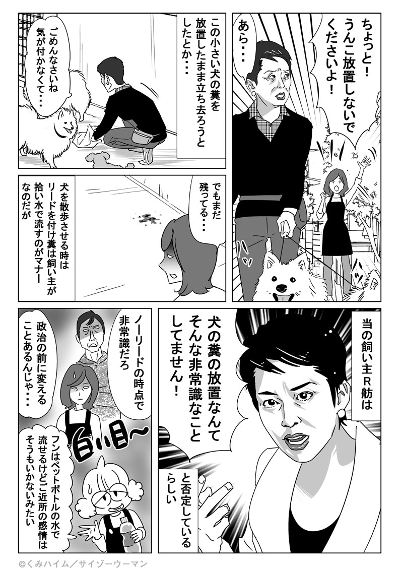 サイゾーウーマンカルチャーマンガ【漫画】R舫の母、犬フン放置で「非常識」 カルチャー マンガ・芸能人のご近所トラブル vol.2 R舫の母、“犬フン放置”で「非常識」と住民怒り!「政治の前にやることあるだろ」(漫画) 2018/03/06 15:00 芸能ウラ情報女性タレント漫画 音や匂いなど、個々の生活における習慣が引き起こす「ご近所トラブル」。昨年8月には、騒音を発端とした刑事事件まで発生しているが、何気ない生活音が、他人にはとってはひどい“雑音”として揉め事に発展したりなどは、一般人の間でもよくあること。 とりわけ、名が知られた有名人ともなると、“ご近所トラブル”が発生する確率はぐんと多くなってしまう様子。 vol.1で登場したセレブモデル・Mは、「ペットの多頭飼い」による”悪臭”が近隣に迷惑を掛ける形となっていたが、ペット飼育は何かとトラブルの種になりやすいもの。女性の政治家で知られるR舫も、自宅で犬を3匹飼育していることが報じられているものの、”毎日の散歩”がちょっとした問題を引き起こしているというのだ。 芸能人の”ご近所トラブル事件簿”を、計4回にわたりマンガでレポート! (vol.1はこちら:セレブなのに「豚クサ臭」!? “ペット30匹”のモデルM、高級住宅街で“鼻つまみ者”) R舫の母、非常識な「犬のフン放置」で住民激怒!?【ご近所トラブル事件簿vol.2】 【サイ女の「芸能人トラブル」バックナンバー】 まだまだある! 芸能人の「ご近所トラブル」サイゾーウーマンの人気記事をとって出し! ■小栗旬、松嶋・反町夫妻、蓮舫……有名人が起こした「ご近所トラブル」事件簿 ■斉藤由貴、不倫で再注目される“モルモン教”――「芸能人と宗教」トラブル ■成宮寛貴も未練!? 金銭苦、事務所トラブルにキャラ変……「引退後に復帰」した芸能人の“明暗” (続きは3月7日より公開) <マンガ/くみハイム> 最終更新:2018/03/08 15:02 ノーリードの飼い主「ウチの子は平気」って言いがち~ 関連記事 小栗旬、松嶋・反町夫妻、蓮舫……有名人が起こした「ご近所トラブル」事件簿小栗旬、“騒音問題”で近隣住民から「出て行け」!? 意外に多い「芸能人ご近所トラブル」「夫にも義父母にも上から目線」ご近所トラブルの火種をまく母に、娘は……真っ黒な服で暴走......岸部一徳の妻が奇行でご近所トラブル!斉藤由貴、不倫で再注目される“モルモン教”――「芸能人と宗教」トラブル その他の作品を読む 次の記事 めちゃイケ後番組に視聴者失望の声 >