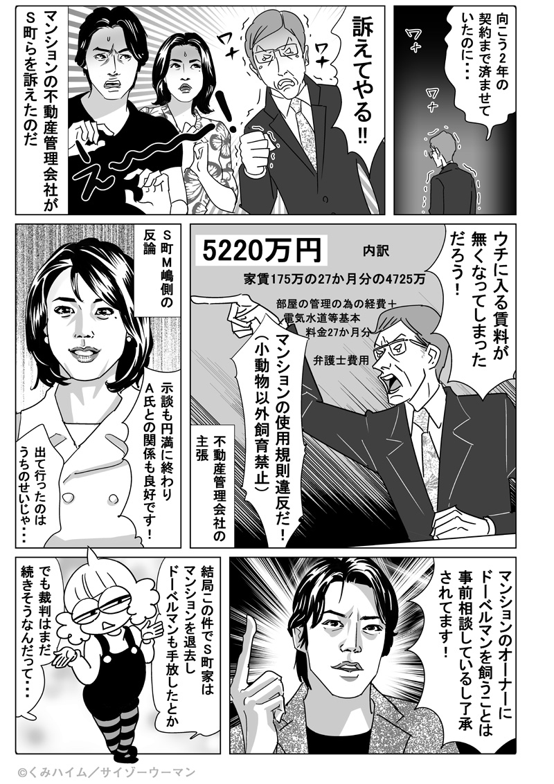 サイゾーウーマンカルチャーマンガ【漫画】犬が原因で「マンション追放」!? カルチャー マンガ・芸能人のご近所トラブル vol.3 【漫画】犬が原因で「マンション追放」!? 5220万円請求もあった衝撃の「ドーベルマン事件」 2018/03/07 15:00 芸能ウラ情報女性タレント漫画 音や匂いなど、個々の生活における習慣が引き起こす「ご近所トラブル」。昨年8月には、騒音を発端とした刑事事件まで発生しているが、何気ない生活音が、他人にはとってはひどい“雑音”として揉め事に発展したりなどは、一般人の間でもよくあること。 とりわけ、名が知られた有名人ともなると、“ご近所トラブル”が発生する確率はぐんと多くなってしまう様子。 vol.1、vol.2では、いずれも衛生面に端を発したいざこざだったが、“障害事件”ともなると事の重大さはケタ違いだ。大物俳優夫婦で知られたS町隆史・M嶋菜々子夫妻の場合、飼育していたドーベルマンがマンション住人に噛み付いたとして、訴訟にまで発展したというのだが……。 芸能人の”ご近所トラブル事件簿”を、計4回にわたりマンガでレポート! (vol.1はこちら:セレブなのに「豚クサ臭」!? “ペット30匹”のモデルM、高級住宅街で“鼻つまみ者”) (vol.2はこちら:R舫の母、“犬フン放置”で「非常識」と住民怒り!「政治の前にやることあるだろ」) M嶋・S町夫妻「ドーベルマン事件」で5220万円!?【ご近所トラブル事件簿vol.3】 【サイ女の「芸能人トラブル」バックナンバー】 まだまだある! 芸能人の「ご近所トラブル」サイゾーウーマンの人気記事をとって出し! ■小栗旬、松嶋・反町夫妻、蓮舫……有名人が起こした「ご近所トラブル」事件簿 ■斉藤由貴、不倫で再注目される“モルモン教”――「芸能人と宗教」トラブル ■猫トラブルの原因は「近隣住民同士のいさかい」――地域猫活動が浮き彫りにする、意外な問題点 (続きは3月8日より公開) <マンガ/くみハイム> 最終更新:2018/03/08 15:03 噛まれてトラウマになった奥さんが可哀相 関連記事 小栗旬、松嶋・反町夫妻、蓮舫……有名人が起こした「ご近所トラブル」事件簿小栗旬、“騒音問題”で近隣住民から「出て行け」!? 意外に多い「芸能人ご近所トラブル」猫トラブルの原因は「近隣住民同士のいさかい」――地域猫活動が浮き彫りにする、意外な問題点石原真理、母娘そろって「出て行ってほしい」! 近隣住人が露わにした嫌悪感斉藤由貴、不倫で再注目される“モルモン教”――「芸能人と宗教」トラブル その他の作品を読む 次の記事 「ヘリコプターペアレント」の実態と対策 >