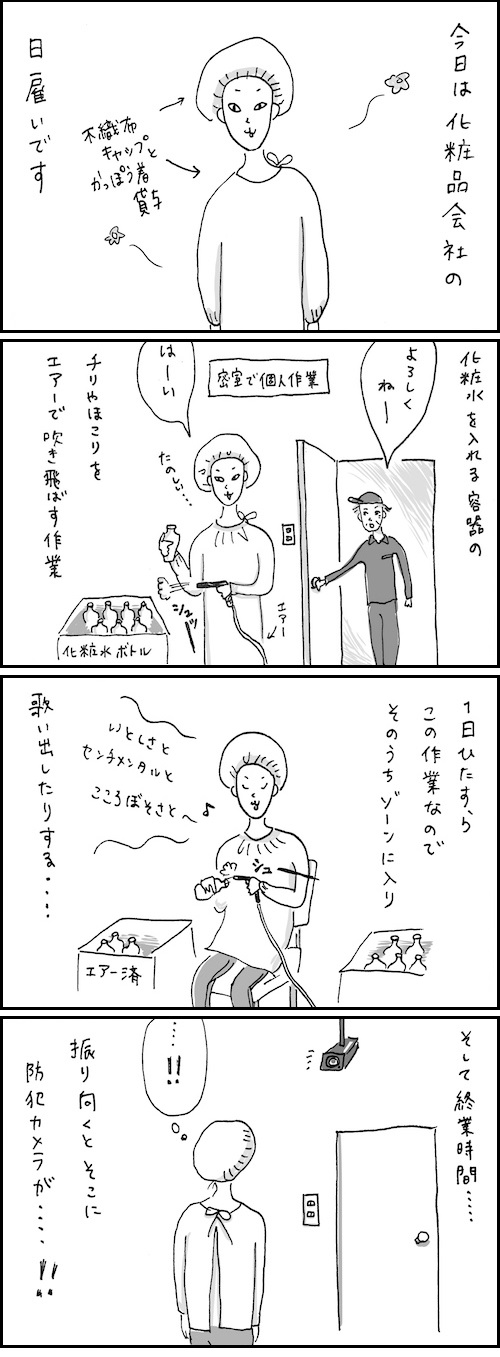 サイゾーウーマンカルチャーマンガ【3話】密室の個人作業で熱唱する女 カルチャー 【連載】柿ノ種まきこ『アラサー独身女、今日も日雇いで生きてます』 【日雇いマンガ】第3話 『監視カメラは見た! 密室の個人作業で熱唱する女』 2018/06/21 13:00 マンガアラサー日雇い柿ノ種まきこ ――「キツイ」「汚い」「男臭い」……なんとなく近寄りがたいイメージのある“日雇労働”。その、実態はどのようなものなのか? 日雇い労働を生業とするアラサー・柿ノ種まきこが、日雇いの日々と人間模様を紹介するマンガ連載がスタート。 第3話 『監視カメラは見た! 密室の個人作業で熱唱する女』 化粧品工場での作業は、化粧水をボトルに充填したり、ラベルを貼ったり、箱詰めしたりします。ボトルは化粧水を充填する前に、中にチリやホコリが入らないように風で吹き飛ばします。これがエアー作業です。 個人作業で黙々とできて楽しいのですが、一人の作業だからって調子にのっちゃだめですね。監視カメラでしっかり見られてました……。 ちなみに化粧品工場は、やっぱり化粧品の香りがすごいです。デパートの化粧品売り場の匂いを“凝縮”した感じ。苦手な方も多い現場かもしれません〜。 ――毎週、木曜日に最新話を更新。次回4話は6月28日(木)更新予定です。 【過去記事はこちらから】 ・1話『アラサー女。基本、日雇いで生きてます。』 ・2話『野菜袋詰めで“きゅうりハイ”』 柿ノ種まきこ/@kakinotane_makiko 日雇いをしながらマンガを描くアラサー。過去には、「iVERY」にて婚活マンガ『女もつらいよ』を連載。現在はインスタグラムにて、マンガを不定期投稿。 https://www.instagram.com/kakinotane_makiko/ 最終更新:2018/08/17 18:30 踊りださなくてよかったね 関連記事 【日雇いマンガ】第2話 『野菜袋詰めで“きゅうりハイ”』【マンガ】第1話 『アラサー女。基本、日雇いで生きてます。』【特別描き下ろしマンガ】3ヵ月会社を休職しました~エピソード2~【マンガ】見れば見るほど増えていく! ”2.5次元推し”は伝染するモノ【推しゴト!!】【マンガ】飲んで飲まれて大号泣! 手みやげ片手に密着警察24時【お酒がやめられない】 その他の作品を読むバックナンバーを読む 次の記事 眞子さまへの美智子さまの思いは? >