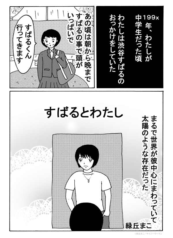 サイゾーウーマンカルチャーマンガ【漫画】「すばるとわたし」前編 カルチャー マンガ・緑丘まこ特別寄稿 【マンガ】関ジャニ∞・渋谷すばるは「太陽みたいだった」――90年代の思い出を綴る 2018/08/04 18:00 ジャニーズマンガ緑丘まこ 「まるで 世界が彼中心に回っていて 太陽のような存在だった――」 * * * 2018年7月で、関ジャニ∞としての活動を完全に終了した渋谷すばる。 彼の脱退によせて、90年代、関西で渋谷すばるの追っかけをしていたマンガ家・緑丘まこが、当時の思い出を振り返ります。 緑丘まこ特別寄稿「すばるとわたし」前編 ――後編は明日、8月5日午後に更新予定です。 緑丘まこ(みどりおか・まこ) 兵庫県育ちの30代独女。漫画とゲームとお酒をこよなく愛する。 センベロ居酒屋やレトロなレストランを発掘するのが休日の楽しみ。 お酒は最高の友達。 Twitter note 最終更新:2018/08/04 18:00 胸がキュンキュン 関連記事 【マンガ】おごられ酒は断れない! ”魅惑のタダ酒”で酩酊した結果【お酒がやめられない】【マンガ】飲んで飲まれて大号泣! 手みやげ片手に密着警察24時【お酒がやめられない】関ジャニ∞・渋谷すばる、最後のイベント出席ウラ話――「メンバーの結束固い」とマスコミも感嘆【マンガ】赤羽のユミコさんに見た「酔っぱらいの法則」【お酒がやめられない】【マンガ】涙酒だよおっかさん! 新幹線でエンドレス泥酔の旅【お酒がやめられない】 その他の作品を読む 次の記事 SnowMan・岩本が“女子化”したワケ >