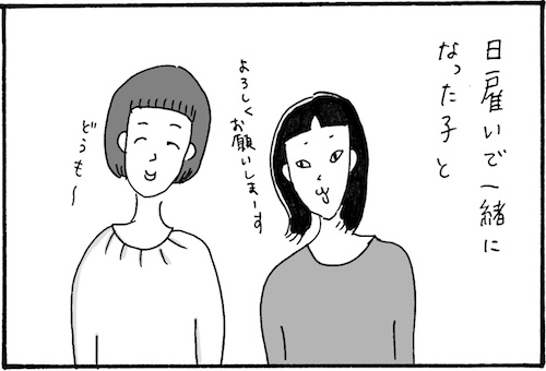 サイゾーウーマンカルチャーマンガ柿ノ種まきこ『アラサー独身女、今日も日雇いで生きてます』【17話】人付き合い苦手あるある カルチャー 【連載】柿ノ種まきこ『アラサー独身女、今日も日雇いで生きてます』 【日雇いマンガ】第17話 『ハートブレイクは突然に! あの日あの時あの場所で……』 2018/09/27 13:00 マンガアラサー柿ノ種まき子日雇い ――「キツイ」「汚い」「男臭い」……なんとなく近寄りがたいイメージのある“日雇労働”。その、実態はどのようなものなのか? 日雇い労働を生業とするアラサー・柿ノ種まきこが、日雇いの日々と人間模様を紹介するマンガ連載がスタート。 第17話 『ハートブレイクは突然に! あの日あの時あの場所で……』 後腐れなく淡白な人間関係の日雇い現場で、まれに意気投合する子と出会えることがあります! けれども、なんだかお友達になれそう! と思っても、連絡先を聞き出すタイミングがわからない…… そんな切ない失敗を何回かしています……! ――毎週、木曜日に最新話を更新。次回18話は10月4日(木)更新予定です。 【過去記事はこちらから】 ・1話『アラサー女。基本、日雇いで生きてます。』 ・2話『野菜袋詰めで“きゅうりハイ”』 ・3話『監視カメラは見た! 密室の個人作業で熱唱する女』 ・4話『サマージョブ~アラサーを襲う熱中症~』 ・5話『日雇い飯! 選ばれたのは◯◯でした』 ・6話『ダメ。ゼッタイ! 倉庫作業のご法度行為』 ・7話『トイレはいずこ……!? マジでもれる5秒前』 ・8話『夏だ! 水着だ! ピッキング!』 ・9話『○○○との親密度で分かる!? ベテランさんの見分け方』 ・10話『ケンカをやめて……感情むき出しの多国籍現場』 ・11話『悪口はブスの始まり!? 〜とあるフィリピーナの格言〜』 ・12話 『ガテン系現場で、運命の恋!? そのお相手とは……』 ・13話 『違う! 違う、そうじゃない。“本当の俺”を語る男』 ・14話 『MUKU・ち……色っぽい? かぼちゃ王子に色めくレディたち』 ・15話 『飾りじゃないのよ、エプロンは。〜勃発! 格付け女の乱〜』 ・16話『あゝ無情……バス終着駅で消えゆくはかなき友情』 柿ノ種まきこ/@kakinotane_makiko 日雇いをしながらマンガを描くアラサー。過去には、「iVERY」にて婚活マンガ『女もつらいよ』を連載。現在はインスタグラムにて、マンガを不定期投稿。 https://www.instagram.com/kakinotane_makiko/ 最終更新:2018/09/27 13:00 友達作るの難しいよね 関連記事 【日雇いマンガ】第16話 『あゝ無情……バス終着駅で消えゆくはかなき友情』【日雇いマンガ】第15話 『飾りじゃないのよ、エプロンは。〜勃発! 格付け女の乱〜』【日雇いマンガ】第14話 『MUKU・ち……色っぽい? かぼちゃ王子に色めくレディたち』【日雇いマンガ】第13話 『違う! 違う、そうじゃない。“本当の俺”を語る男』【マンガ】第1話 『アラサー女。基本、日雇いで生きてます。』 その他の作品を読むバックナンバーを読む 次の記事 後藤真希、甥と混浴告白で波紋 >