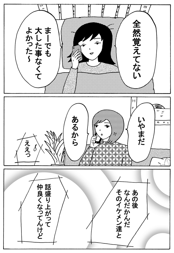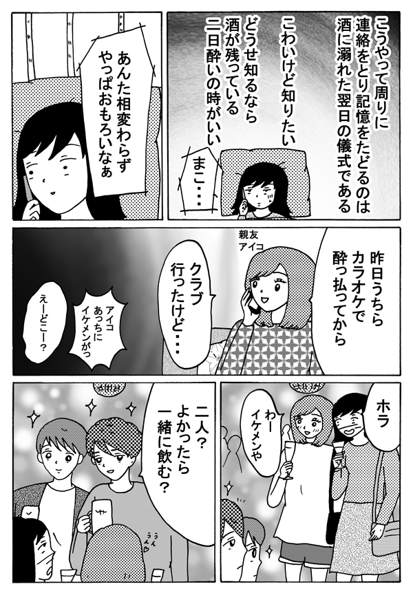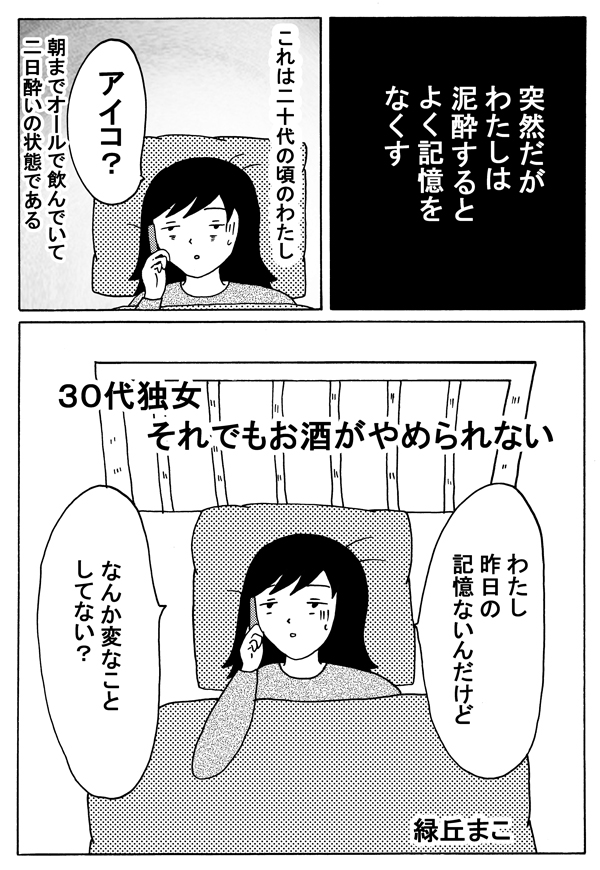 サイゾーウーマンカルチャーマンガ緑丘まこ『30代独女、それでもお酒がやめられない』【漫画】泥酔したあの夜の行動は… カルチャー 【連載】「30代独女、それでもお酒がやめられない」第14回(緑丘まこ) 【マンガ】本当にそんなことしてたの!? 泥酔した翌朝に知る「自分」のヤバイ行動【お酒がやめられない・14回】 2018/10/06 18:00 30代独女、それでもお酒がやめられないマンガ緑丘まこ 「酒に強くも弱くもないわたしは、よくお酒に飲まれる」――。 20代から酒に飲まれつづけた漫画家・緑丘まこが酒と出会いと黒歴史を綴る、飲んだくれコミックエッセイ。土曜のひとり飲みのおともにどうぞ。 第14回:電話に出てくれるかが、第一関門 次のページ 江頭のマネよりヤバいこと 12次のページ 関連記事 【タイ移住マンガ】バンコクの「賃貸アパート」はかなり快適!? 家具付きワンルームがこんなお値段!【7話】【日雇いマンガ】第18話 『即席!? お見合い大作戦〜倉庫の花嫁編〜』【マンガ】「ケーサツ呼ぶよ!」怒れる老婆、浮かれる街国人……観光名所・浅草を見つめ直してみようか【東京をディグる・8話】【婚約破棄マンガ】これが「毒親」のコントロール!? 1対3での”ムチャクチャな罵倒”についていけない!【第6回】【マンガ】2ショット撮影、○○の手渡し……アイドル活動をしている推しが尊すぎてヤバイ!【2.5次元の推しゴト!!】 その他の作品を読むバックナンバーを読む