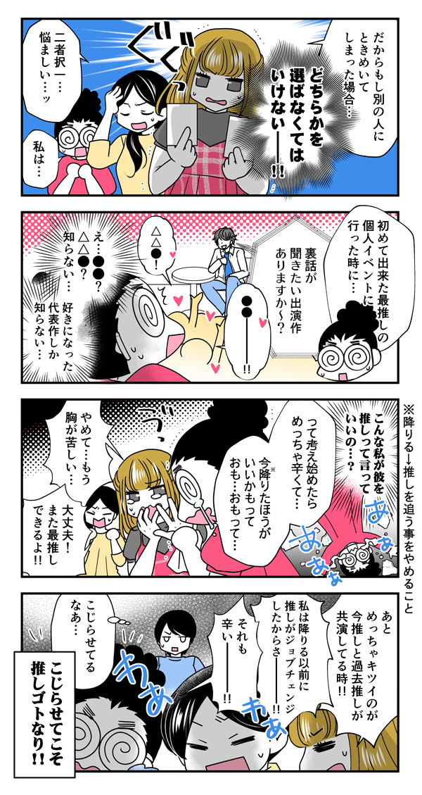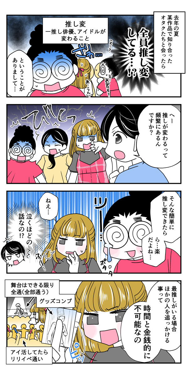 サイゾーウーマンカルチャーマンガ【漫画】推しは1人しか選べない! カルチャー 【連載】「2.5次元の推しゴト!!~イケメンにハマりましたルポ~」第24回(吉田にく) 【マンガ】推しは1人しか選べない――! オタクたちの「推し変」悲喜こもごも【2.5次元の推しゴト!!】 2018/10/08 10:00 マンガ吉田にく2.5次元の推しゴト!!~イケメンにハマりましたルポ~ 城田優、斎藤工、宮野真守など、有名俳優も多く輩出している“2.5次元“の世界。 ひょんなきっかけから2.5次元にハマった漫画家・吉田にくが、2.5次元素人の編集・ちーとともに、その楽しさとおっかけ舞台裏、人気のイケメン情報までを全力レポート! 第24回:こじらせてこそ推しゴトなり! 吉田にく(よしだ・にく) バリ島と2.5次元にどっぷりハマり続ける漫画家。 趣味は旅行と漫画を描くこと、2.5次元舞台歴まだ2年ちょいながらも、自由業であることを活かし平日も舞台に通っている。 2018年の推しメンは前山剛久、櫻井圭登、荒牧慶彦他にもわさわさ。 先行抽選チケットを勝ち取るために日々徳を積む事を心がけています! 近著に『バリ島だらだら旅』(ワニブックス)。 <2.5次元の推しゴト!! バックナンバーはこちら> ■1~3回まとめ読み ■4~7回まとめ読み ■8~11回まとめ読み ■第12回:電車の隣に”あの人”が!? 若手俳優の交通事情” ■第13回:まさかこんな場所で!? 2.5次元俳優のプライベートを目撃!” ■第14回:2.5次元俳優とニアミス! 狭い座席でまさかの密着!?” ■第15回:病気の原因はまさかの「アレ」! 2.5次元活動は”肉体労働” ■第16回:謎の筋肉痛……2.5次元応援は「テニスと同じ」!? ■第17回:ニチアサの「仮面ライダーシリーズ」キャストは宝の山! ■第18回:「会いに行けるメンズアイドル」で、イケメン俳優の青田刈り!? ■第19回:メンズアイドルの「過激サービス」は運営次第!? ■第20回:アイドルの現場に潜入!! ■第21回:超・近距離で会える醍醐味! ■第22回:たった10秒の「推しとの握手」in特典会!! ■第23回:近くにいる推しが尊すぎてヤバイ! 最終更新:2019/05/24 16:12 推しもそこまで思われたら幸せだよ 関連記事 【タイ移住マンガ】バンコクの「賃貸アパート」はかなり快適!? 家具付きワンルームがこんなお値段!【7話】【日雇いマンガ】第18話 『即席!? お見合い大作戦〜倉庫の花嫁編〜』【マンガ】「ケーサツ呼ぶよ!」怒れる老婆、浮かれる街国人……観光名所・浅草を見つめ直してみようか【東京をディグる・8話】【婚約破棄マンガ】これが「毒親」のコントロール!? 1対3での”ムチャクチャな罵倒”についていけない!【第6回】【婚約破棄マンガ】優しい彼が「まるで別人」!? 同居に反対してたハズなのにどうして!【第5回】 その他の作品を読む 次の記事 “モラハラ”と批判噴出の芸能人3人 >