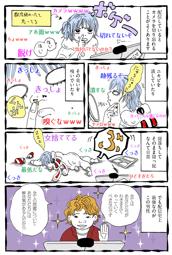 サイゾーウーマンカルチャーマンガあさの☆ひかり『ネット配信で人生が狂った人の裏側ぶっちゃけていいスか!?』【5話】カメラ切り忘れ事件簿 カルチャー 【マンガ連載】ネット配信で人生が狂った人の裏側ぶっちゃけていいスか!? 【配信者マンガ】プライベートがダダ漏れ!? 「カメラの切り忘れ」が招いた”赤っ恥”事件簿!!【第5回】 2018/10/20 13:00 マンガあさの☆ひかりネット配信で人生が狂った人の裏側ぶっちゃけていいスか!? 不倫バレ、嫉妬で放火、ニセ札作りに救急車……何度警察のお世話になったって、ぜ~んぶ「配信のネタ」なんです!? マンガ『芸能界の裏側ぶっちゃけていいスか!?』で数々の芸能タブーをぶっちゃけてきた 怖いもの知らずのグラドル漫画家・あさの☆ひかりが、今度はなんと「ネット配信者の世界」を大暴露!! アブナイ配信者たちのヤバ~い裏側、ぜんぶマンガに描いちゃいます! 女という幻想をブチ壊す 次のページ 聖人君子のような発言ののち 12次のページ 関連記事 【タイ移住マンガ】3日前のメール、なんで返してくれないの……? 長引く”遠距離”に、募る不安【9話】【日雇いマンガ】第20話 『驚愕!! 作業着1着○万のオシャレピーポー専用求人』【マンガ】忍者が現れ、おじさんも吸い込まれる魔境……「浅草地下街」の奥には何が?【東京をディグる・10話】【婚約破棄マンガ】「調停」=「弁護士のいらない裁判」のようなもの? 申立書を提出してみた!【第10回】【婚約破棄マンガ】婚約者を”訴える”ってどうすれば? 30分・五千円で「法テラス」に相談してみたら【第9回】 その他の作品を読むバックナンバーを読む
