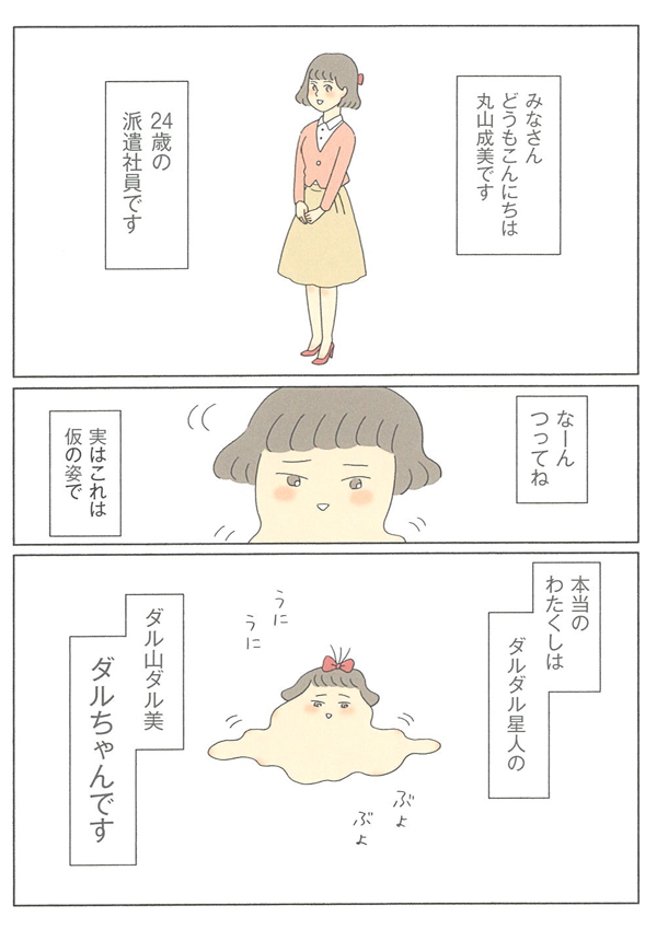 サイゾーウーマンカルチャーインタビュー『ダルちゃん』インタビュー前編 カルチャー 『ダルちゃん』著者・はるな檸檬さんインタビュー/前編 「ジェンダー論の、少し先の話」――著者・はるな檸檬さんに聞く『ダルちゃん』執筆の背景 2018/12/05 16:00 マンガインタビューはるな檸檬 『ダルちゃん』(はるな檸檬/小学館) 資生堂が運営する「ウェブ花椿」での連載開始からSNSを中心に話題となり、最終回を迎えた10月4日以降はさまざまな反響であふれかえった、漫画家・はるな檸檬さん初となるストーリーマンガ『ダルちゃん』。12月6日に小学館より単行本が全2巻で発売されることとなり、話題再燃が予想される中、「ジェンダー論?」「主人公は何かのメタファー?」「女性の幸せって結局なに?」などなど……読者が気になっているであろうことすべてを、はるなさんに聞いた。 ――当初、花椿さんからどういった打診があったのでしょうか? はるな檸檬さん(以下、はるな) 「20代女性に向けた、共感を得られるものを描いてほしい」と打診をいただき考えたのが、『ダルちゃん』でした。 ――そのときから、プロットが出来上がっていたのでしょうか。 はるな いえ。ぼんやりと、「主人公は20代OLで、恋愛したり、友達ができたり。『ウェブ花椿』さんで詩の公募をしていたから、詩を絡めていきたい」という大筋はありましたが、あまり詳細なプロットはなくて。でも担当編集さんから「このあとどうなるんですか!?」とせっつかれることもなく、自由にやらせてもらいました。これから何が起こるかわからないまま原稿を受け取ってくださった花椿さんの、懐の深さを感じました(笑)。 正直、不安もあったと思うんです。担当編集さんからは、『れもん、うむもん!』(※はるなさんの出産・育児エッセイ、新潮社)を読んでいただいたことが打診のきっかけだとおっしゃっていただいたこともあったし、わたし自身も、もうちょっとギャグも絡めた明るい話を描くつもりでいたんです。でも、勝手にこうなってしまった……というのが、正直な経緯です。 当初は、笑いを含んだライトな“あるある”を散りばめた作風を意識していたというはるなさん。だが物語は、読者の深層をえぐる方向へと、舵を切る。 ――どのあたりから方向性が変わったんですか? はるな 2話目からですね。1話目は、もう少しライトな語り口で描くつもりでいました。だけどもともと、心の奥の方で、「オブラートに包まずに、言いたいことを言いたい」という本心があったんですよね。優しくふんわりと語りかける作風で、「気持ちが軽くなりました」と言っていただけるような表現も良いけれど、それだけでは伝わらないものもあるのでは、と思いまして。そうした本心が、2話目からどろりと出ちゃいました。それでも、担当編集さんは何も言わず受けに徹してくださって。本当にありがたかったです。 ――主人公がOLで、その描写がリアリティにあふれるところも、読者に刺さった要因の一つかと思います。OLさんを取材されたのでしょうか。 はるな わたし自身、OL経験が3年間あるんです。漫画家のアシスタントと並行して、派遣で事務OLをしていました。書類をあちらの部署からこちらの部署へ移動させたり、お茶くみをしたり、給湯室でめっちゃふきんを洗っていました。 ――当時の、言いたくても言えなかったことが、こうして湧き出たんでしょうか。 はるな 言いたいことを言えないのは言わずもがな、「社会に出て会社にいる」こと自体、不自然な状況じゃないですか。みんなやっていることですが、わたしは毎日、疲労感がすごくて。毎朝、いったんその空気になじむように、「その場で成り立つ自分」にスイッチングすることが、できないわけではないけど、結構しんどかった。 たとえば、エレベーターで居合わせた人に、「今日はすごくいい天気ですね」なんてコミュニケーションを取ることは、社会を円滑に進めるひとつのテクニックだし悪いことではまったくないけど、すごく面倒くさかったんです。だからわたし、部署が2階にあって社員食堂が15階にあったけど、毎日お昼は階段で15階まで移動していましたからね。エレベーターで人に会うのが面倒くさすぎて(笑)。足腰が強くなりました(笑)。 ――肉体的疲労感より、精神的疲労感が勝ったんですね。 はるな 体が疲れる方が楽でした。いい経験をさせてもらったけれど、「ずっと会社にいるのは、わたしには厳しい」と実感し、「家で仕事がしたい」と思ったことが、漫画を描き始めた理由のひとつでもあります。 ――その“スイッチング”がつまり、ダルちゃんで言うところの“擬態”ですか? はるな そうですね。いったん、何かのフリをしないと、ついだらっとした部分が出ちゃうといいますか。特にスイッチングの最たるものが、社会人1年目で経験した、求人広告の営業の仕事です。いわゆる「100軒回ってくるまで帰ってくるな!」というようなところ。アポなしで各店に