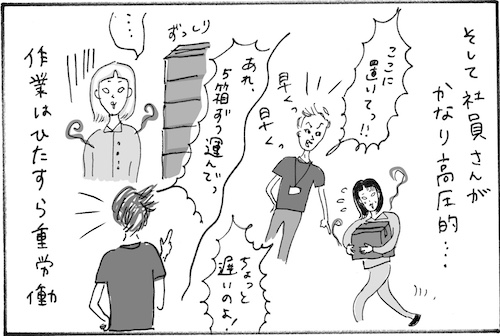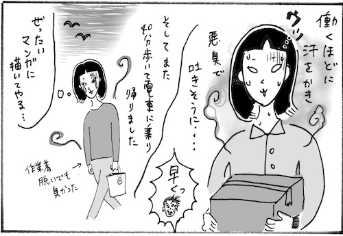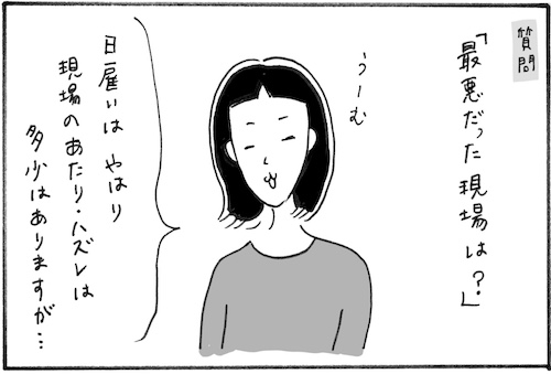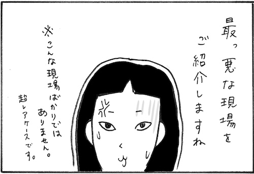 サイゾーウーマンカルチャーマンガ柿ノ種まきこ『アラサー独身女、今日も日雇いで生きてます』日雇いのハズレ現場 カルチャー 【連載】柿ノ種まきこ『アラサー独身女、今日も日雇いで生きてます』 【日雇いマンガ】24話『素朴な疑問にお答え! 〜史上サ・イ・ア・ク現場の1日〜』 2018/12/06 13:00 日雇いマンガ柿ノ種まき子 ――「キツイ」「汚い」「男臭い」……なんとなく近寄りがたいイメージのある“日雇労働”。その、実態はどのようなものなのか? 日雇い労働を生業とするアラサー・柿ノ種まきこが、日雇いの日々と人間模様を紹介します。 今回は、インスタグラム(@kakinotane_makiko)上にフォロワーさんから寄せられた質問やリクエストにまきこさんがお答えします! 第24話『素朴な疑問にお答え! 〜史上サ・イ・ア・クな現場の1日〜』 今回も、インスタグラムでフォロワーの皆さんからいただいた質問に漫画でお答えしていきます。 「先週の一番楽しかった現場は?」に引き続き、「最悪だった日雇いは?」という質問です。 しんどい現場はいくつかありましたが、清潔感がない現場は本当にきついものがありました……。 こういう現場に当たったら派遣会社に伝えて今後あたらないようにしてもらえます。それが日雇いの良いところでもありますね。 ――毎週、木曜日に最新話を更新。次回も、まきこさんのインスタグラム上でフォロワーさんに募集した質問やリクエストをもとにした日雇いエピソードを公開。12月13日(木)の更新をお楽しみに! 柿ノ種まきこ/@kakinotane_makiko 日雇いをしながらマンガを描くアラサー。過去には、「iVERY」にて婚活マンガ『女もつらいよ』を連載。現在はインスタグラムにて、マンガを不定期投稿。 https://www.instagram.com/kakinotane_makiko/ 最終更新:2018/12/06 13:00 想像しただけでくさそう…… 関連記事 【日雇いマンガ】23話『素朴な疑問にお答え! 〜アラサーが選ぶベスト・オブ現場〜』【日雇いマンガ】22話『素朴な疑問にお答え! 〜アラサーOLが日雇いを始めた理由〜』【日雇いマンガ】『まきこの簡単クッキング~アラサー農家直伝! 大根大量消化レシピ~』【日雇いマンガ】特別編2『アラサー独身女、家業は農家です〜エッチな○○編〜』【日雇いマンガ】特別編1『アラサー独身女、家業は農家です〜秘密のガールズトーク編〜』 その他の作品を読むバックナンバーを読む 次の記事 ジャニーさんの差し入れ定番4品 >