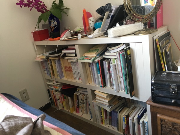 ベッド横にある本棚ですが、最初に、本を取りやすいレイアウトに変更したことで改善できました。あとは不要な本を減らすだけで終了なのですが……。