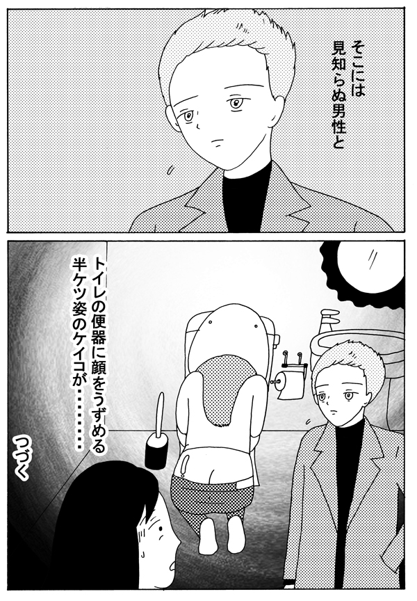 サイゾーウーマンカルチャーマンガ緑丘まこ『30代独女、それでもお酒がやめられない』【20回】親友ケイコが深夜のトイレで カルチャー 【連載】「30代独女、それでもお酒がやめられない」(緑丘まこ) 【マンガ】頼れるケイコが、深夜のトイレで……!? 女3人・シェアハウス事件簿!【20回】 2019/01/12 18:30 緑丘まこ30代独女、それでもお酒がやめられないマンガ ま~こ~ ――「30代独女、それでもお酒がやめられない」次回の更新は1月26日(土)になります。お楽しみに! 緑丘まこ(みどりおか・まこ) 兵庫県育ちの30代独女。漫画とゲームとお酒をこよなく愛する。 センベロ居酒屋やレトロなレストランを発掘するのが休日の楽しみ。 お酒は最高の友達。 Twitter note 【バックナンバーはこちらから】 (第1回はこちら:酒飲みの聖地・赤羽に、女ひとりでやってきたのだ) (第2回はこちら:赤羽のユミコさんに見た「酔っぱらいの法則」) (第3回はこちら:渋谷のコインロッカーに挟まれた三十路の夜) (第4回はこちら:安ワインが招いた“三日酔い”と血染めバスタブのゆくえ) (第5回はこちら:新幹線でエンドレス泥酔の旅) (第6回はこちら:手みやげ片手に密着警察24時) (第7回はこちら:”魅惑のタダ酒”で酩酊した結果) (第8回はこちら:目覚めたら美女とキス!?) (第9回はこちら:忘れられない”初体験”) (第10回はこちら:初めての夏、”アイツ”は突然やってきた) (第11回はこちら:親友ケイコが”ヤル気”になった夜) (第12回はこちら:支離滅裂な思考と「逆ナン」の夜) (第13回はこちら:上野でせんべろ昼飲みツアー) (第14回はこちら:泥酔した翌朝に知る「自分」のヤバイ行動) (第15回はこちら:新幹線で朝酒、トロッコ列車で昼酒!) (第16回はこちら:熊と地ビールと尿意) (第17回はこちら:バングラデシュのマイクさん) (第18回はこちら:「使えない」と言われるマイクさん) (第19回はこちら:マイクさんが見せた”凄い特技”) 前のページ1234 最終更新:2019/01/12 18:46 カオスな現場! 関連記事 【配信者マンガ】オフパコの恨みは重い!? リスナーとの”恋愛トラブル”大暴露!【第15回】【タイ移住マンガ】タイの職場を初公開! ローカルな「タウンハウス」ってどんな場所?【19話】【マンガ・ヤリマン引退】目を離すとすぐ舐めちゃう! 「お年頃」の娘にヤリママは……【第16回】【婚約破棄マンガ】彼はやっぱり来なかった――! 2回目の調停、“私”がとった選択は【第31回】【婚約破棄マンガ】「今後は出廷しない」ってそんなのアリ!? 予想外すぎる「彼の逃亡」【第30回】 その他の作品を読むバックナンバーを読む 次の記事 筋腫で「子宮全摘」が推奨される不可解さ >