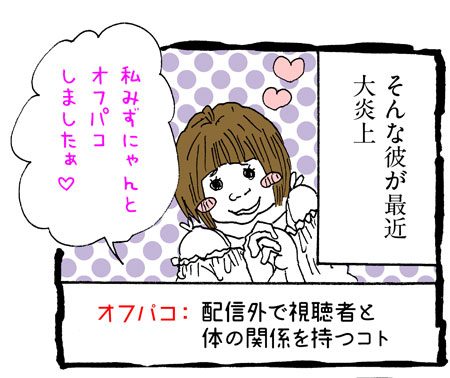 サイゾーウーマンカルチャーマンガあさの☆ひかり『ネット配信で人生が狂った人の裏側ぶっちゃけていいスか!?』【15話】オフパコの恨みは重い!? カルチャー 【マンガ連載】ネット配信で人生が狂った人の裏側ぶっちゃけていいスか!? 【配信者マンガ】オフパコの恨みは重い!? リスナーとの”恋愛トラブル”大暴露!【第15回】 2019/01/12 13:00 マンガあさの☆ひかりネット配信で人生が狂った人の裏側ぶっちゃけていいスか!? 不倫バレ、嫉妬で放火、ニセ札作りに救急車……何度警察のお世話になったって、ぜ~んぶ「配信のネタ」なんです!? マンガ『芸能界の裏側ぶっちゃけていいスか!?』で数々の芸能タブーをぶっちゃけてきた 怖いもの知らずのグラドル漫画家・あさの☆ひかりが、今度はなんと「ネット配信者の世界」を大暴露!! オフパコの恨みは重い 次のページ そんなあさのも視聴者と……!? 12次のページ 関連記事 【タイ移住マンガ】タイの職場を初公開! ローカルな「タウンハウス」ってどんな場所?【19話】【マンガ・ヤリマン引退】目を離すとすぐ舐めちゃう! 「お年頃」の娘にヤリママは……【第16回】【マンガ・ヤリマン引退】思いがけない「フェチプレイ」!? 寝起きに浴びた我が子の洗礼【第15回】【婚約破棄マンガ】彼はやっぱり来なかった――! 2回目の調停、“私”がとった選択は【第31回】【マンガ】ピル使用者への「思い込みあるある」――セクハラすぎる誤解にイライラ!【第16回】 その他の作品を読むバックナンバーを読む