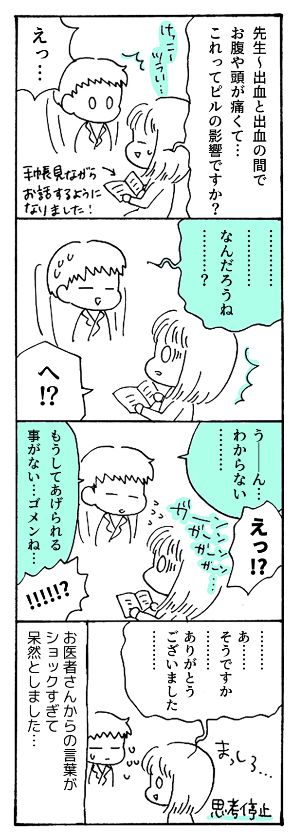 サイゾーウーマンカルチャーマンガ【19回】痛みの原因を聞いてみた! カルチャー 【連載】私の生理、「病名」がつきました。~月経困難症、ピルに漢方あれこれ5年試してみたら~ 【マンガ】ピル服用で「頭痛と腹痛」? 原因をお医者さんに聞いてみた!【第19回】 2019/01/15 18:00 マンガ私の生理、「病名」がつきました。月経困難症 「生理痛なんて、みんな一緒!」 1カ月ごとにやってくる、尋常じゃない腹痛・寒気・吐き気……。 周囲の言葉を信じて10数年も耐え続けた「生理痛」、医者にかかってみたらビョーキと診断されちゃった!? 30歳から治療を開始した「月経困難症」との向き合い方をつづる、日常闘病コミックエッセイ。 お医者さんに聞いてみた (つづく) ――「私の生理、病名がつきました。」は、毎週日・月・火の週3回更新になります。お楽しみに! <著者プロフィール> まお 月経困難症。体験した事や思った事を4コマ漫画にしています。自分の体、大切な人の体を考える事や、行動する事のきっかけになればうれしいです。ポジティブに生きてるオタク。 <バックナンバーはこちら> ■第1回~第10回まとめ読み……私の生理、ビョーキでした!? 【第11回】「ピルを飲む時間」は結構シビア 【第12回】「月経困難症+就職」で検索してみたら 【第13回】生理痛で欠勤、正直に言ってみた 【第14回】ピルを飲んで数カ月、どうなった? 【第15回】PMSが軽くなった!? 【第16回】ピルへの誤解あるある! 【第17回】「いいなー」って何!? 【第18回】不正出血とナゾの痛み 最終更新:2019/01/18 22:55 予想外のぶん投げ回答! 関連記事 【マンガ】頼れるケイコが、深夜のトイレで……!? 女3人・シェアハウス事件簿!【20回】【配信者マンガ】オフパコの恨みは重い!? リスナーとの”恋愛トラブル”大暴露!【第15回】【タイ移住マンガ】タイの職場を初公開! ローカルな「タウンハウス」ってどんな場所?【19話】【日雇いマンガ】29話『謎のマスク女参上!! 過剰な厚着の理由とは……』【マンガ・ヤリマン引退】目を離すとすぐ舐めちゃう! 「お年頃」の娘にヤリママは……【第16回】 その他の作品を読む 次の記事 元ももクロ・有安、ソロ転進に暗雲!? >