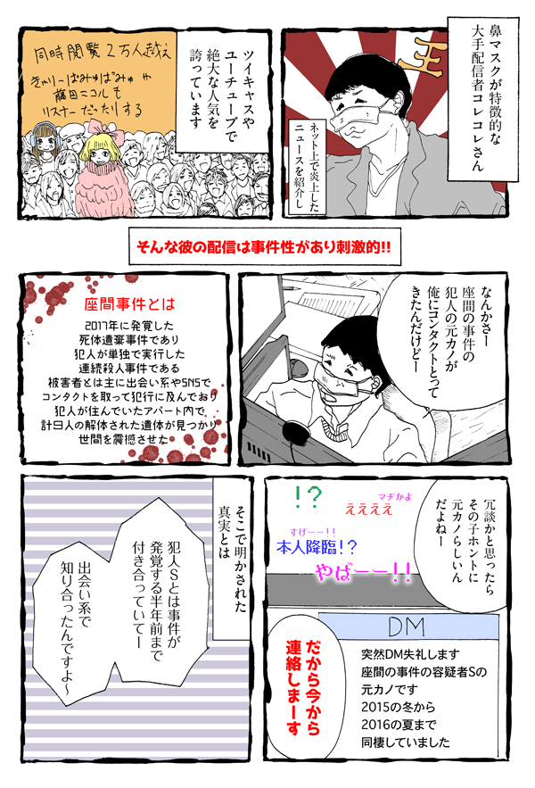 サイゾーウーマンカルチャーマンガあさの☆ひかり『ネット配信で人生が狂った人の裏側ぶっちゃけていいスか!?』配信者マンガ・13~16話まとめ読み カルチャー 【マンガ連載】ネット配信で人生が狂った人の裏側ぶっちゃけていいスか!? 【マンガ】ネット配信で人生が狂った人の裏側ぶっちゃけていいスか!?【13~16話・まとめ読み】 2019/01/26 13:00 マンガあさの☆ひかりネット配信で人生が狂った人の裏側ぶっちゃけていいスか!? 殺人犯の元カノと生電話! ――毎週土曜に、最新話を更新。次回をお楽しみに! あさの☆ひかり 10月3日生まれ。東京都出身。 グラビアアイドルとして活動したのち、エッセイマンガ家として多数の作品を発表。潜入取材を得意とし、社会の裏側からサブカル、芸能界まで幅広いネタをマンガにしている。 既刊に『芸能界の裏側ぶっちゃけていいスか!? 三十路グラドルのつぶやき』(ぶんか社)『何度か消されかけましたが、こりずに芸能界の裏側ぶっちゃけていいスか!? 』(同)など。 ◎あさの☆ひかりTwitter https://twitter.com/asano_hikali <バックナンバーはこちら> ■第1回~第4回・まとめ読み ■第5回~第8回・まとめ読み ■第9回~第12回・まとめ読み 前のページ1234 最終更新:2019/01/26 13:00 コレコレさんの配信、ちょっと気になる~! 関連記事 【マンガ・ヤリマン引退】セックス後、「マンを拭いてくれる男」には気をつけろ!【第20回】【マンガ】生理痛でセカンドオピニオン! ちょっと居づらい「婦人科あるある」【第22回】【配信者マンガ】「殺人犯の元カノ」と生電話!? マスコミより早い「座間事件」ウラ話【第16回】【マンガ記事】運命の相手は「不潔なキモ男」!? DNA婚活で“相性最高の相手”を探した結果……【タイ移住マンガ】「日本にいる時よりも、かっこよくなったね」――タイで頑張る彼と、今後のこと【20話】 その他の作品を読むバックナンバーを読む 次の記事 破局告白も反感買ったタレント3人 >