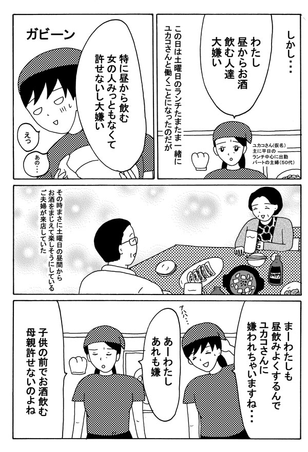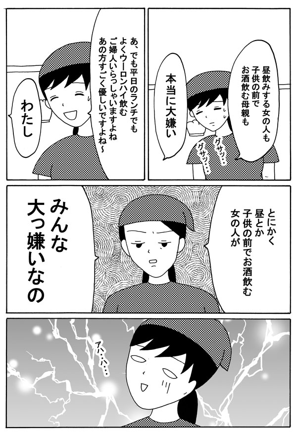 サイゾーウーマンカルチャーマンガ緑丘まこ『30代独女、それでもお酒がやめられない』【22回】「昼からお酒」は許せない? カルチャー 【連載】「30代独女、それでもお酒がやめられない」(緑丘まこ) 【マンガ】「子どもの前で酒を飲む母親」「昼からお酒」は許せない? 【22回】 2019/02/09 18:00 緑丘まこ 緑丘まこ30代独女、それでもお酒がやめられないマンガ 「昼酒を飲む人、大嫌い」 次のページ 休憩に入ってからも 前のページ12345次のページ 関連記事 【配信者マンガ】臭い汁、悪口、詐欺通知……は序の口!? 配信者たちの年賀状!【第18回】【タイ移住マンガ】「軌道に乗ったら」なんてあり得ない!? 早くも不安のタイ暮らし【22話】【マンガレポ】オタクの課金は意味ナシ!? 配信投票が謎深い「ジュノン・スーパーボーイ・コンテスト」の光と闇【マンガ・ヤリマン引退】風呂上がりの「おまたパンパン」が気持ちいい!【第24回】【マンガ】私は「何者か」になるんだよ――茨城とヤンキーを嫌悪する、その理由【17話】 その他の作品を読むバックナンバーを読む