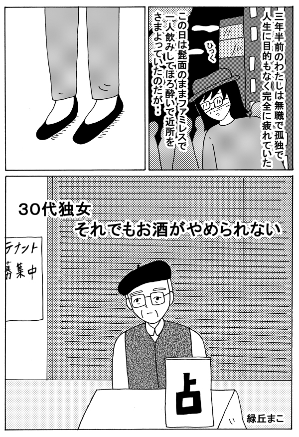サイゾーウーマンカルチャーマンガ緑丘まこ『30代独女、それでもお酒がやめられない』【23回】路上の占い師は当たるのか カルチャー 【連載】「30代独女、それでもお酒がやめられない」(緑丘まこ) 【マンガ】路上の占い師は信用できるのか――「破滅」と占われたあの日【23回】 2019/02/23 18:00 緑丘まこ マンガ緑丘まこ30代独女、それでもお酒がやめられない 「酒に強くも弱くもないわたしは、よくお酒に飲まれる」――。 20代から酒に飲まれつづけた漫画家・緑丘まこが酒と出会いと黒歴史を綴る、飲んだくれコミックエッセイ。土曜のひとり飲みのおともにどうぞ。 第23回:占い師とわたし・前編 次のページ 路上の占い師に…… 12345次のページ 関連記事 【配信者マンガ】「R18配信」で2度の衝撃!? 臨場感たっぷりの「セックス音」にムラムラしたものの【第20回】【タイ移住マンガ】とりあえず渡航日決めちゃおう! 怒涛の「転職&結婚」プロジェクト【24話】【日雇いマンガ】35話『分かりたい、分からない……! ブルーベリー農園の悲劇』【マンガ・ヤリマン引退】妊婦の性欲、セックス以外でどう発散する? オナニー・AV鑑賞、そして……【第27回】【マンガ】元ヤンの同僚はいい子だった――「固定観念」に囚われた自分に、気づいた話【21話】 その他の作品を読むバックナンバーを読む