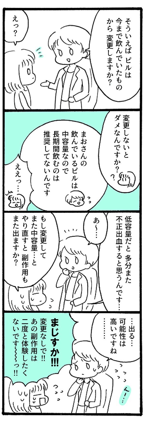 サイゾーウーマンカルチャーマンガ【48回】中容量ピル、長期服用はNG? カルチャー 【連載】私の生理、「病名」がつきました。~月経困難症、ピルに漢方あれこれ5年試してみたら~ 【マンガ】中容量ピル、ずっと飲んでちゃいけないの? 「ピル変更」を提案されるも…【第48回】 2019/03/26 19:00 まお マンガ私の生理、「病名」がつきました。月経困難症 「生理痛なんて、みんな一緒!」 1カ月ごとにやってくる、尋常じゃない腹痛・寒気・吐き気……。 周囲の言葉を信じて10数年も耐え続けた「生理痛」、医者にかかってみたらビョーキと診断されちゃった!? 30歳から治療を開始した「月経困難症」との向き合い方をつづる、日常闘病コミックエッセイ。 またピル変更? (つづく) ――「私の生理、病名がつきました。」は、毎週日・月・火の週3回更新になります。お楽しみに! <著者プロフィール> まお 月経困難症。体験した事や思った事を4コマ漫画にしています。自分の体、大切な人の体を考える事や、行動する事のきっかけになればうれしいです。ポジティブに生きてるオタク。 <バックナンバーはこちら> ■第1回~第10回まとめ読み……私の生理、ビョーキでした!? ■第11回~第20回まとめ読み……ピル服用、7カ月の間に起きたこと 【第21回】2度目の生理は…地獄! 【第22回】婦人科でセカンドオピニオン! 【第23回】婦人科で…言葉責め!? 【第24回】2人目の医者は果たして… 【第25回】ナカで動かさないで! 【第26回】「前と同じピル」でも平気なの? 【第27回】3カ月のピル実験! 【第28回】「低用量ピル」が合わない体質!? 【第29回】はじめての漢方は? 【第30回】漢方がマズかった理由 【第31回】「中容量ピル」にいよいよ挑戦! 【第32回】”血栓”は他人事じゃない!? 【第33回】生理痛に無理解な職場 【第34回】「中容量ピル」に変えて3日後 【第35回】足のむくみって……痛いんだ! 【第36回】不正出血がなくなった! 【第37回】職場のストレスが体に出た! 【第38回】「生理」を知らない男性 【第39回】生理を「知る機会」 【第40回】「ブラック企業」と生理 【第41回】ブラック企業、心の支えだったのは 【第42回】月経困難症から、結婚へ 【第43回】医者の「紹介状」ってどんなもの? 【第44回】「とりあえず」の通院先、どう選ぶ? 【第45回】産婦人科の隣にラブホテル!? 【第46回】卵巣に「のう腫」がある!? 【第47回】卵巣のう腫は良性?悪性? 最終更新:2019/03/26 19:13 また生理痛で倒れると思うと… 関連記事 【マンガ】卵巣に「のう腫」が見つかった!? 予想外の告知にショック!【第46回】【マンガ】30代独女、初めての「オムツデビュー」! もう我慢したくない【25回】【配信者マンガ】皇居のお堀に「異物投入」するとどうなる!?【第24回】【マンガ】ふっくらタイ移住まんが~ブラック企業を辞めたらバンコクでした~【最終章・まとめ読み】【マンガ・ヤリマン引退】2歳児はなぜ「毛」に執着する? その心理は……【第34回】 その他の作品を読む 次の記事 有安、関係者が明かす“わがまま”ぶり >