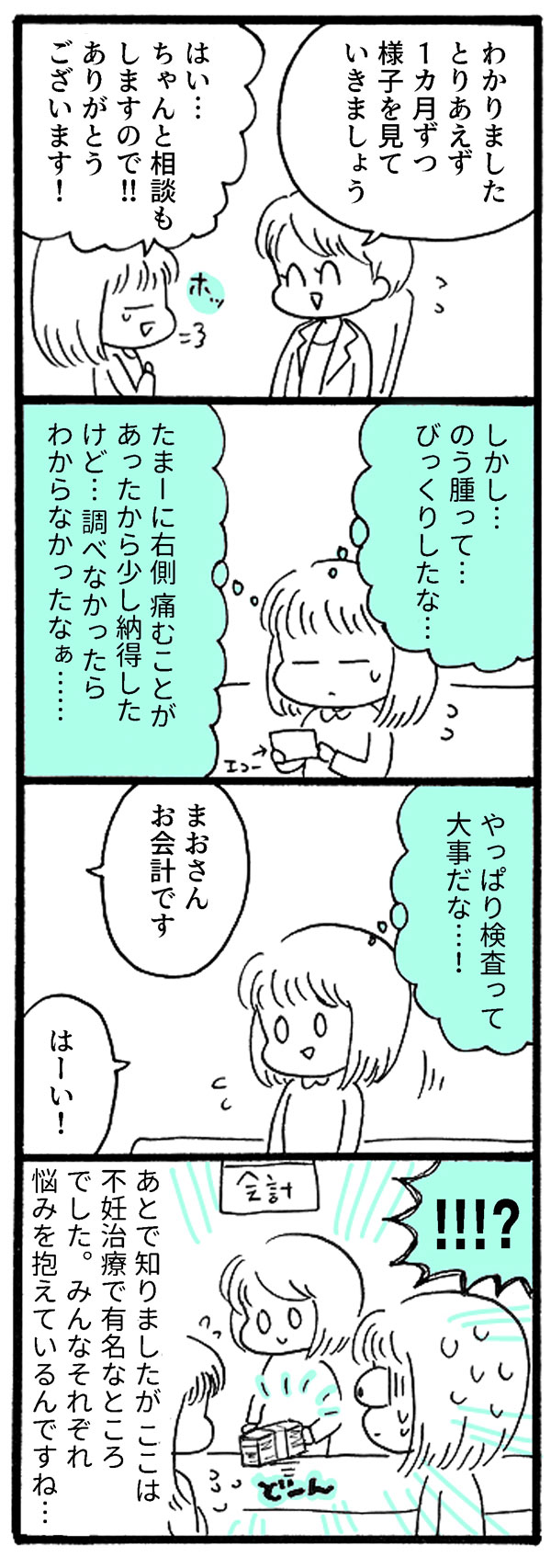 サイゾーウーマンカルチャーマンガ【49回】婦人科、それぞれの悩み カルチャー 【連載】私の生理、「病名」がつきました。~月経困難症、ピルに漢方あれこれ5年試してみたら~ 【マンガ】婦人科の悩みは人それぞれ! 度肝を抜かれた「お会計」【第49回】 2019/03/31 20:00 まお マンガ私の生理、「病名」がつきました。月経困難症 「生理痛なんて、みんな一緒!」 1カ月ごとにやってくる、尋常じゃない腹痛・寒気・吐き気……。 周囲の言葉を信じて10数年も耐え続けた「生理痛」、医者にかかってみたらビョーキと診断されちゃった!? 30歳から治療を開始した「月経困難症」との向き合い方をつづる、日常闘病コミックエッセイ。 悩みはそれぞれ (つづく) ――「私の生理、病名がつきました。」は、毎週日・月・火の週3回更新になります。お楽しみに! <著者プロフィール> まお 月経困難症。体験した事や思った事を4コマ漫画にしています。自分の体、大切な人の体を考える事や、行動する事のきっかけになればうれしいです。ポジティブに生きてるオタク。 <バックナンバーはこちら> ■第1回~第10回まとめ読み……私の生理、ビョーキでした!? ■第11回~第20回まとめ読み……ピル服用、7カ月の間に起きたこと 【第21回】2度目の生理は…地獄! 【第22回】婦人科でセカンドオピニオン! 【第23回】婦人科で…言葉責め!? 【第24回】2人目の医者は果たして… 【第25回】ナカで動かさないで! 【第26回】「前と同じピル」でも平気なの? 【第27回】3カ月のピル実験! 【第28回】「低用量ピル」が合わない体質!? 【第29回】はじめての漢方は? 【第30回】漢方がマズかった理由 【第31回】「中容量ピル」にいよいよ挑戦! 【第32回】”血栓”は他人事じゃない!? 【第33回】生理痛に無理解な職場 【第34回】「中容量ピル」に変えて3日後 【第35回】足のむくみって……痛いんだ! 【第36回】不正出血がなくなった! 【第37回】職場のストレスが体に出た! 【第38回】「生理」を知らない男性 【第39回】生理を「知る機会」 【第40回】「ブラック企業」と生理 【第41回】ブラック企業、心の支えだったのは 【第42回】月経困難症から、結婚へ 【第43回】医者の「紹介状」ってどんなもの? 【第44回】「とりあえず」の通院先、どう選ぶ? 【第45回】産婦人科の隣にラブホテル!? 【第46回】卵巣に「のう腫」がある!? 【第47回】卵巣のう腫は良性?悪性? 【第48回】中容量ピル、長期服用はNG? 最終更新:2019/03/31 20:00 お金も時間もかかるのよね 関連記事 【配信者マンガ】70万円を荒稼ぎ!? 「アダルト配信サイト」に挑戦してみたら【第24回】【マンガ】婚約破棄で訴えてやる!~毒親持ち彼氏と167日間壮絶バトル~【1~3話+告知】【マンガ・ヤリマン引退】何度言ってもダメなのに……!? 「母よりネコ」の優先順位【第36回】【日雇いマンガ】40話『化粧品会社の現場で出会ったとある主婦さんのお話 〜前編〜』【マンガ・ヤリマン引退】母、娘、そしてネコ! 家庭を見守るふじおの挙動【第35回】 その他の作品を読む 次の記事 AV男優・しみけんがスパッと解答 >