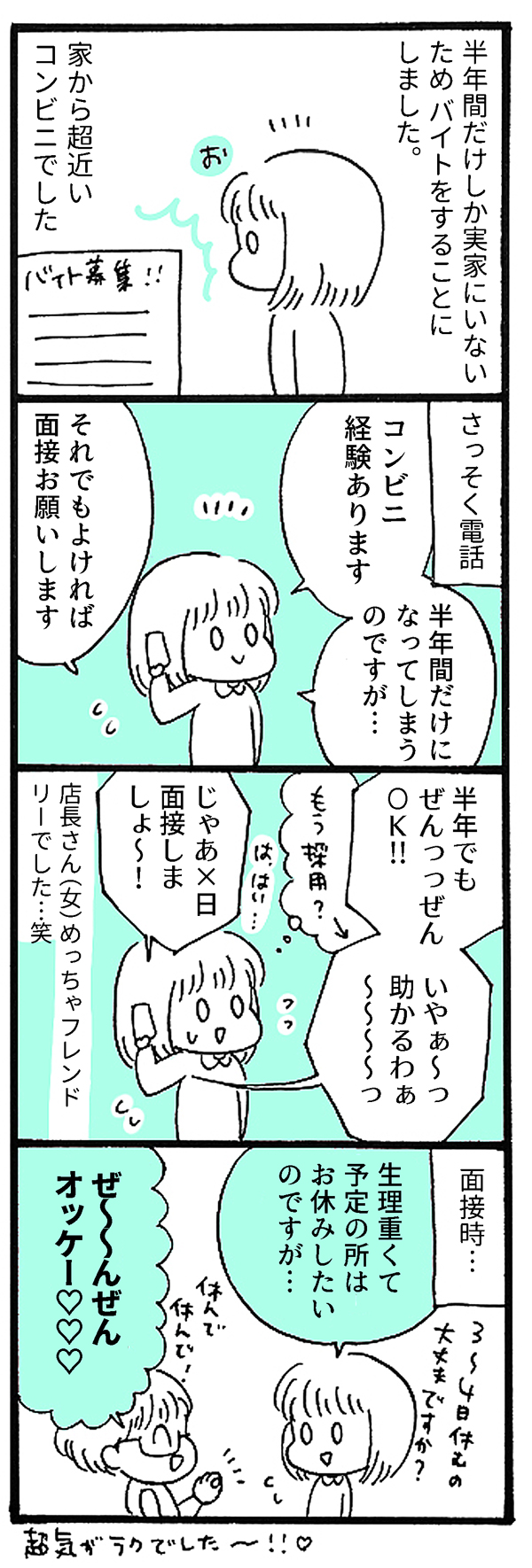 サイゾーウーマンカルチャーマンガ【50回】コンビニで短期バイト! カルチャー 【連載】私の生理、「病名」がつきました。~月経困難症、ピルに漢方あれこれ5年試してみたら~ 【マンガ】近所のコンビニで短期バイト! 「不利な条件」でも大丈夫?【第50回】 2019/04/01 19:00 まお 私の生理、「病名」がつきました。月経困難症マンガ 「生理痛なんて、みんな一緒!」 1カ月ごとにやってくる、尋常じゃない腹痛・寒気・吐き気……。 周囲の言葉を信じて10数年も耐え続けた「生理痛」、医者にかかってみたらビョーキと診断されちゃった!? 30歳から治療を開始した「月経困難症」との向き合い方をつづる、日常闘病コミックエッセイ。 バイトの条件 (つづく) ――「私の生理、病名がつきました。」は、毎週日・月・火の週3回更新になります。お楽しみに! <著者プロフィール> まお 月経困難症。体験した事や思った事を4コマ漫画にしています。自分の体、大切な人の体を考える事や、行動する事のきっかけになればうれしいです。ポジティブに生きてるオタク。 <バックナンバーはこちら> ■第1回~第10回まとめ読み……私の生理、ビョーキでした!? ■第11回~第20回まとめ読み……ピル服用、7カ月の間に起きたこと 【第21回】2度目の生理は…地獄! 【第22回】婦人科でセカンドオピニオン! 【第23回】婦人科で…言葉責め!? 【第24回】2人目の医者は果たして… 【第25回】ナカで動かさないで! 【第26回】「前と同じピル」でも平気なの? 【第27回】3カ月のピル実験! 【第28回】「低用量ピル」が合わない体質!? 【第29回】はじめての漢方は? 【第30回】漢方がマズかった理由 【第31回】「中容量ピル」にいよいよ挑戦! 【第32回】”血栓”は他人事じゃない!? 【第33回】生理痛に無理解な職場 【第34回】「中容量ピル」に変えて3日後 【第35回】足のむくみって……痛いんだ! 【第36回】不正出血がなくなった! 【第37回】職場のストレスが体に出た! 【第38回】「生理」を知らない男性 【第39回】生理を「知る機会」 【第40回】「ブラック企業」と生理 【第41回】ブラック企業、心の支えだったのは 【第42回】月経困難症から、結婚へ 【第43回】医者の「紹介状」ってどんなもの? 【第44回】「とりあえず」の通院先、どう選ぶ? 【第45回】産婦人科の隣にラブホテル!? 【第46回】卵巣に「のう腫」がある!? 【第47回】卵巣のう腫は良性?悪性? 【第48回】中容量ピル、長期服用はNG? 【第49回】婦人科の悩みは人それぞれ 最終更新:2019/04/01 19:05 ノリのいい人だと話しやすいよね 関連記事 【配信者マンガ】70万円を荒稼ぎ!? 「アダルト配信サイト」に挑戦してみたら【第24回】【マンガ】婚約破棄で訴えてやる!~毒親持ち彼氏と167日間壮絶バトル~【1~3話+告知】【マンガ・ヤリマン引退】何度言ってもダメなのに……!? 「母よりネコ」の優先順位【第36回】【日雇いマンガ】40話『化粧品会社の現場で出会ったとある主婦さんのお話 〜前編〜』【マンガ・ヤリマン引退】母、娘、そしてネコ! 家庭を見守るふじおの挙動【第35回】 その他の作品を読む 次の記事 アデルを捨てた父が、生活困窮 >