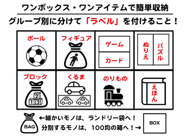 おもちゃをグループ別に分けて、使うモノだけを棚に入れます。まずは、ダンボールなどで分別してください。ワンボックスにワンアイテム収納を目安に、ざっくりと分けます。収納箱は、フタを付けずに“ポイポイと投げ入れる”簡単なモノに。1つの棚を2〜3つに分別するなら、ファイルボックスがオススメです。