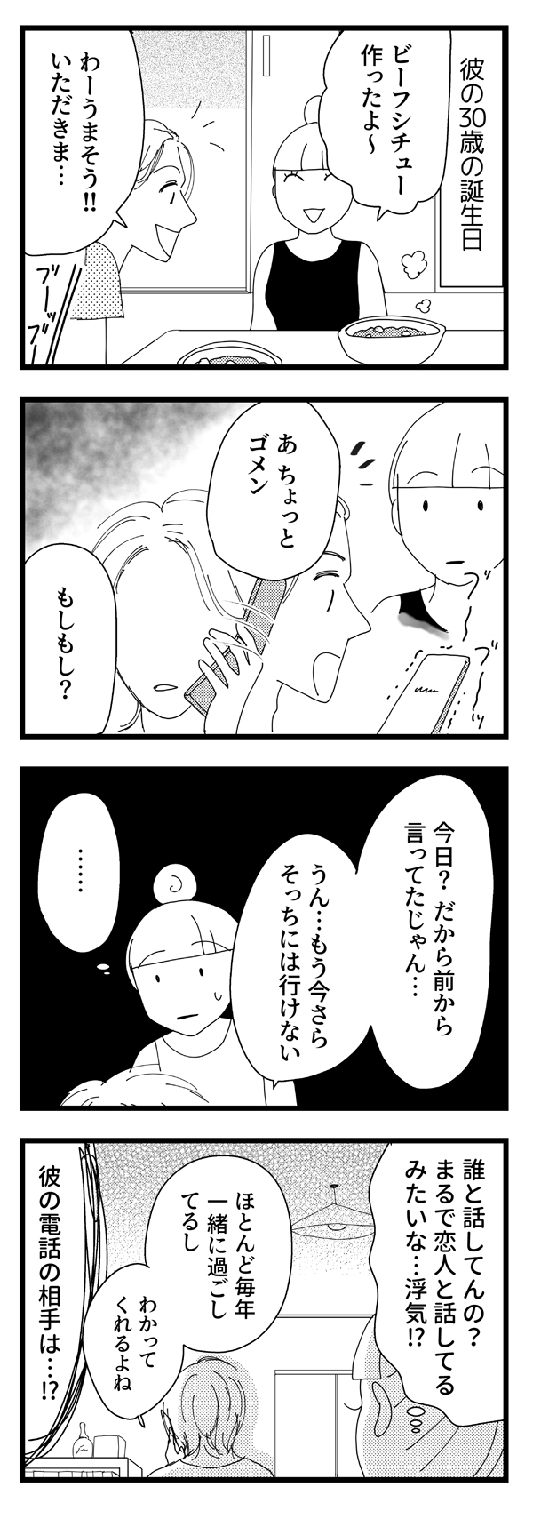 サイゾーウーマンカルチャーマンガ音咲椿『婚約破棄で訴えてやる!~毒親持ち彼氏と167日間壮絶バトル~』【毒親6話】彼の誕生日に、電話が… カルチャー 【マンガ】私の彼が毒親から逃れられない!~婚約破棄で訴えてやる・番外編~ 【毒親支配マンガ】「まさか浮気?」彼の誕生日、何度もかかってくる電話。その相手は……【6話】 2019/04/16 13:30 音咲椿 マンガ毒親音咲椿婚約破棄で訴えてやる! 「君ってなんだか、僕の母に似てるんだよね」――。 イケメン彼氏の「不可解」な婚約破棄と、それに伴う顛末を描いた実録コミックエッセイ 『婚約破棄で訴えてやる!~毒親持ち彼氏と167日間壮絶バトル~』の前日談。 婚約していた彼は、なぜ突然手のひらを返したのか? あんなに嫌悪していたはずの“毒母”側についたのはどうして? 交際していた当時の記憶から あの頃の彼の心理と背景を掘り下げてみると、意外な事実が見えてきた――! 彼の誕生日に ――『私の彼が毒親から逃れられない!』は毎週月・火更新。お楽しみに! <バックナンバーはこちら> ■第1回……婚約破棄から10年、残る疑問 ■第2回……彼のママは専業主婦だった ■第3回……「辞表出しといた」って!? ■第4回……我が子にセックス回数を暴露!? ■第5回……実家暮らしだった彼と、恋に落ちるまで ■前作……『婚約破棄で訴えてやる!』1-3話 *** 前作『婚約破棄で訴えてやる!』は、電子書籍にてすべてご覧いただけます。 ★★★各電子書店にてお買い求めいただけます★★★ 音咲椿(おとさき・つばき) 男性向けグラビア誌編集長を経て、ポット出版社刊「女の子×女の子のためのエロチックブック・Carmilla」にてイラスト・漫画家デビュー。 単行本「イケメン外国人たちとベッドで異文化交流した結果。」(ぶんか社刊)好評発売・配信中。 マンガ「『こんな大きいなんて聞いてない!』~外国人と異文化SEX、ヤりまくりました。」「婚約破棄で訴えてやる!~毒親持ち彼氏と167日間壮絶バトル~」配信中。 音咲椿Twitter(@otosaki6666) 最終更新:2019/04/16 13:30 なんか恋人みたいな会話 関連記事 【マンガ】私の彼が毒親から逃れられない! ~婚約破棄で訴えてやる・番外編~【新連載】【マンガ】ピルを飲むと太るって本当? 4年で15キロ増えてしまった、私の場合【第56回】【毒親支配マンガ】「婚約関係」に至った顛末――実家暮らしだった彼と、恋に落ちるまで【5話】【マンガ】低用量ピルに変えたから……じゃなかった!?「不正出血」が起きたワケ【第55回】【配信者マンガ】三十路アイドル、「パンツ売り」で一攫千金!? オークションを生配信してみたら【第25回】 その他の作品を読むバックナンバーを読む 次の記事 TOKIO・松岡、「小僧」呼びのウワサ解説 >