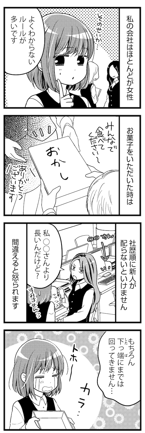 サイゾーウーマンカルチャーマンガ本当にあった笑える話【漫画】女子職場での絶対ルール カルチャー 『本当にあった笑える話』(ぶんか社より) 【マンガ・ブラックお仕事体験談!】間違ったら即イジメ!? 女性の職場での絶対ルール 2019/04/21 11:00 『本当にあった笑える話』編集部 本当にあった笑える話マンガ漫画 【「本当にあった笑える話」(ぶんか社)より】 しきたり 〜東京都・23歳・事務・まきこさんからのお便り〜 ©天野こひつじ/ぶんか社 「勤めていた会社の経営が悪化し、社長が神棚を購入。そのお金は勝手に社員の給料から天引されていた!」「風邪をひいて会社に休みの連絡を入れたら、39度以上熱がある証拠写真がないと休めないと言われた!!」など…… 『本当にあった笑える話』シリーズ誌では、みなさまからの投稿を随時募集しております。 →投稿は【こちらから】 ★テーマは「芸能人目撃談」「赤っ恥エピソード」「ペットトラブル」など幅広く募集中! 最終更新:2019/04/21 11:00 こうして太っていくお局であった……。 関連記事 【マンガ・死ぬかと思った体験談!】お気に入りの洋服に友人から衝撃のヒトコト……!!【マンガ】「ピル太り」実録レポート! 生活を変えてないのに、みるみる体重が増えていく【第57回】【毒親支配マンガ】「まさか浮気?」彼の誕生日、何度もかかってくる電話。その相手は……【6話】【マンガ】年収3千万ってどんな人種【『 俺たちつき合ってないから』2話】【配信者マンガ】三十路アイドル、「パンツ売り」で一攫千金!? オークションを生配信してみたら【第25回】 その他の作品を読む 次の記事 泥沼離婚から再婚した芸能人3人 >