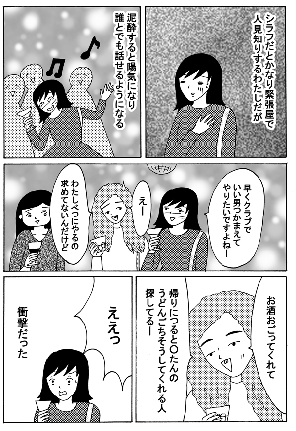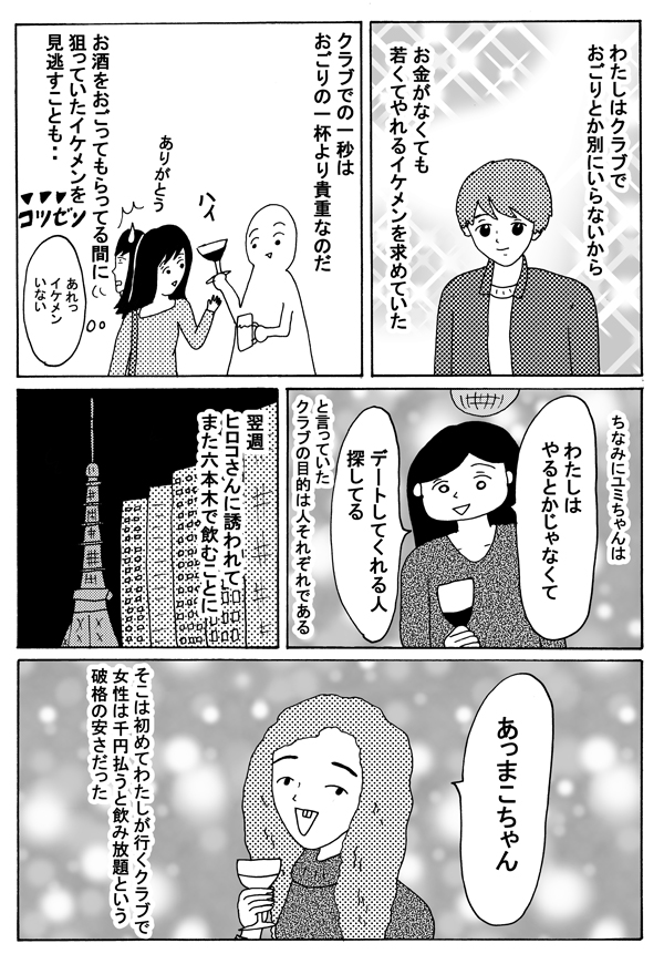 サイゾーウーマンカルチャーマンガ緑丘まこ『30代独女、それでもお酒がやめられない』【27回】それでもお酒がやめられない カルチャー 【連載】「30代独女、それでもお酒がやめられない」(緑丘まこ) 【マンガ】それでもお酒がやめられない! 40歳独女・ヒロコさんと酒を飲んだあの日【27回】 2019/04/20 18:00 緑丘まこ マンガ緑丘まこ30代独女、それでもお酒がやめられない クラブの目的、三者三様 次のページ ヒロコさん、ボスザルみたい 前のページ1234567次のページ 関連記事 【マンガ・ヤリマン引退】娘2歳、なんでもヤリたいお年頃……汚いモノは綺麗にしましょ!?【第42回】【日雇いマンガ】43話『若さという名の暴力〜キラキラ女子大生質問攻めの乱〜』【マンガ・ヤリマン引退】私、だから筋トレできないんです!? ヤリママの言い訳【第41回】【マンガ】「ピル太り」実録レポート! 生活を変えてないのに、みるみる体重が増えていく【第57回】【毒親支配マンガ】「まさか浮気?」彼の誕生日、何度もかかってくる電話。その相手は……【6話】 その他の作品を読むバックナンバーを読む