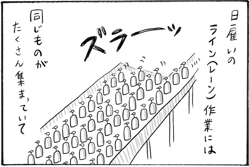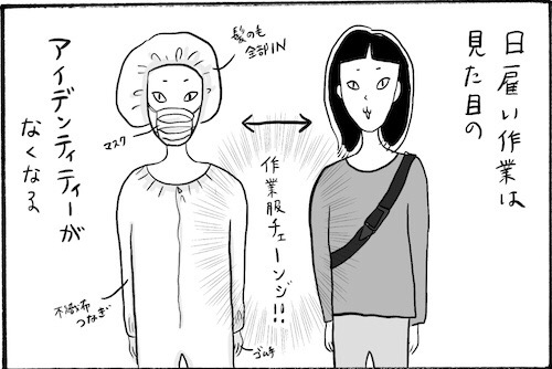 サイゾーウーマンカルチャーマンガ柿ノ種まきこ『アラサー独身女、今日も日雇いで生きてます』【日雇いマンガ】36〜42話 カルチャー 【連載】柿ノ種まきこ『アラサー独身女、今日も日雇いで生きてます』 【日雇いマンガ】『アラサー独身女、今日も日雇いで生きてます』【36~42話まとめ読み】 2019/05/06 13:00 サイゾーウーマン編集部(@cyzowoman) マンガ柿ノ種まき子日雇い ――「キツイ」「汚い」「男臭い」……なんとなく近寄りがたいイメージのある“日雇労働”。その、実態はどのようなものなのか? 日雇い労働を生業とするアラサー・柿ノ種まきこが、日雇いの日々と人間模様を紹介します。 今回は36〜42話をまとめ読みでお送りいたします。 (1〜7話まとめ読みはこちら) (8〜14話まとめ読みはこちら) (15〜21話まとめ読みはこちら) (22〜28話まとめ読みはこちら) (29〜35話まとめ読みはこちら) 第36話『ライン(作業)だョ! 全員集合。◯◯フェチおすすめ現場』 世の中にはいろんなフェチがいるけれど……。 わたしは同じものが整頓されてたり密集してるのが好き……! 日雇いのレーン作業にはもってこいのフェチで、日々楽しんでおります。 第37話『君の名は〜性別を超える作業服マジック〜』 工場関係の日雇いなどは、全身が隠されたマスク姿になります。 そのため、名前を呼ばれるというよりは、雰囲気で呼ばれることが多いです。 「おばさん!」と呼ばれるとちょっとカチンときそうですが、「おかーさん!」だと、ちょっとオブラートに包まれてていいかな。 いつまでお姉さんと呼んでいただけるのか……どきどきです。 次のページ 第38話『SAY YES……朝には声で感じ合おうよ〜強制参加のナゾ儀式〜』 1234次のページ 関連記事 【日雇いマンガ】43話『若さという名の暴力〜キラキラ女子大生質問攻めの乱〜』【日雇いマンガ】42話『目撃!! 畑の中に突如現れたVIP専用休憩室』【日雇いマンガ】41話『化粧品会社の現場で出会ったとある主婦さんのお話 〜後編〜』【日雇いマンガ】40話『化粧品会社の現場で出会ったとある主婦さんのお話 〜前編〜』【日雇いマンガ】39話『プチ潔癖さんにおすすめな◯◯の現場』 その他の作品を読むバックナンバーを読む