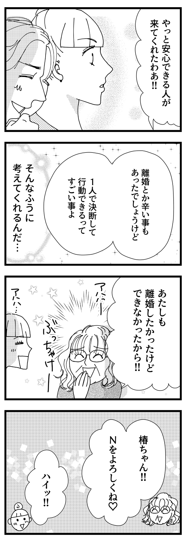 サイゾーウーマンカルチャーマンガ音咲椿『婚約破棄で訴えてやる!~毒親持ち彼氏と167日間壮絶バトル~』【毒親13話】彼母に受け入れられた…! カルチャー 【マンガ】私の彼が毒親から逃れられない!~婚約破棄で訴えてやる・番外編~ 【毒親支配マンガ】私、彼母に受け入れられた……!?「やっと安心できる」と告げられて【13話】 2019/05/13 13:00 音咲椿 マンガ毒親音咲椿婚約破棄で訴えてやる! 「君ってなんだか、僕の母に似てるんだよね」――。 イケメン彼氏の「不可解」な婚約破棄と、それに伴う顛末を描いた実録コミックエッセイ 『婚約破棄で訴えてやる!~毒親持ち彼氏と167日間壮絶バトル~』の前日談。 婚約していた彼は、なぜ突然手のひらを返したのか? あんなに嫌悪していたはずの“毒母”側についたのはどうして? 交際していた当時の記憶から あの頃の彼の心理と背景を掘り下げてみると、意外な事実が見えてきた――! 受け入れてくれた…! ――『私の彼が毒親から逃れられない!』は毎週月・火更新。お楽しみに! ⇒このマンガへのコメントを読む・書く <バックナンバーはこちら> ■第1回……婚約破棄から10年、残る疑問 ■第2回……彼のママは専業主婦だった ■第3回……「辞表出しといた」って!? ■第4回……我が子にセックス回数を暴露!? ■第5回……実家暮らしだった彼と、恋に落ちるまで ■第6回……彼の誕生日に、何度も電話が……。 ■第7回……彼母の「息子依存」が過剰すぎる? ■第8回……朝4時、彼は電話で謝罪中 ■第9回……バツイチの私、義母からの印象は? ■第10回…いよいよ彼母と初対面の日 ■第11回…初めて会った彼母は……! ■第12回…「過去の彼女」と比較された ■前作……『婚約破棄で訴えてやる!』1-3話 *** 前作『婚約破棄で訴えてやる!』は、電子書籍にてすべてご覧いただけます。 ★★★各電子書店にてお買い求めいただけます★★★ 音咲椿(おとさき・つばき) 男性向けグラビア誌編集長を経て、ポット出版社刊「女の子×女の子のためのエロチックブック・Carmilla」にてイラスト・漫画家デビュー。 単行本「イケメン外国人たちとベッドで異文化交流した結果。」(ぶんか社刊)好評発売・配信中。 マンガ「『こんな大きいなんて聞いてない!』~外国人と異文化SEX、ヤりまくりました。」「婚約破棄で訴えてやる!~毒親持ち彼氏と167日間壮絶バトル~」配信中。 音咲椿Twitter(@otosaki6666) 最終更新:2019/05/13 13:00 幸せの絶頂! 関連記事 【マンガ】私の彼が毒親から逃れられない! ~婚約破棄で訴えてやる・番外編~【新連載】【マンガ・ヤリマン引退】雷門や車夫よりも!? 「金のうんこ」が2歳児に与えるインパクト【第44回】【マンガ・ヤリマン引退】浅草名物「人力車」に乗ってみたい! 娘より”乗り気”なママの欲望【第43回】【マンガ】半年間で「卵巣のう腫」はどうなった? 実家暮らしと「バイト生活」を終えて【第63回】【毒親支配マンガ】彼母が「今まで何人か見てきた」元カノたち……。私に下す評価は!?【12話】 その他の作品を読むバックナンバーを読む 次の記事 KinKi・光一、「やっぱりKinKiだね」発言にファン歓喜 >