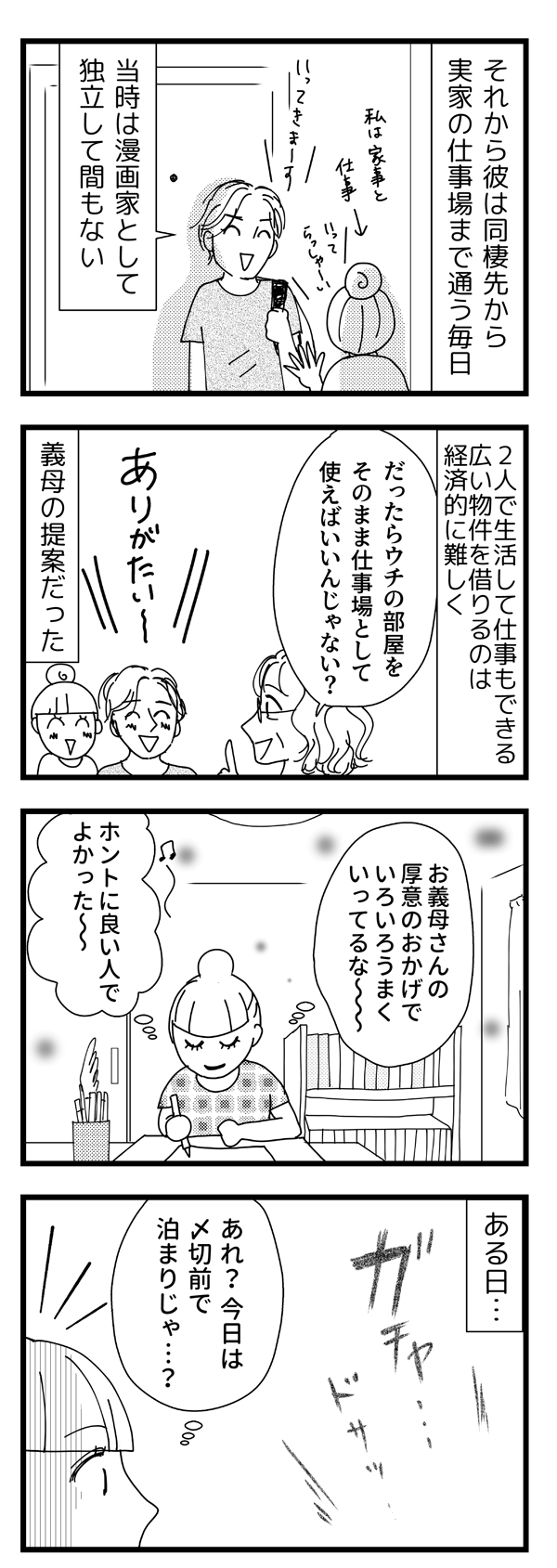 サイゾーウーマンカルチャーマンガ音咲椿『婚約破棄で訴えてやる!~毒親持ち彼氏と167日間壮絶バトル~』【毒親16話】実家を往復する彼 カルチャー 【マンガ】私の彼が毒親から逃れられない!~婚約破棄で訴えてやる・番外編~ 【毒親マンガ】同棲開始後、実家とアパートを往復する彼。平穏な毎日と思っていたら……【16話】 2019/05/21 13:30 音咲椿 マンガ毒親音咲椿婚約破棄で訴えてやる! 「君ってなんだか、僕の母に似てるんだよね」――。 イケメン彼氏の「不可解」な婚約破棄と、それに伴う顛末を描いた実録コミックエッセイ 『婚約破棄で訴えてやる!~毒親持ち彼氏と167日間壮絶バトル~』の前日談。 婚約していた彼は、なぜ突然手のひらを返したのか? あんなに嫌悪していたはずの“毒母”側についたのはどうして? 交際していた当時の記憶から あの頃の彼の心理と背景を掘り下げてみると、意外な事実が見えてきた――! 実家とアパートの往復 ――『私の彼が毒親から逃れられない!』は毎週月・火更新。お楽しみに! ⇒このマンガへのコメントを読む・書く <バックナンバーはこちら> ■第1回……婚約破棄から10年、残る疑問 ■第2回……彼のママは専業主婦だった ■第3回……「辞表出しといた」って!? ■第4回……我が子にセックス回数を暴露!? ■第5回……実家暮らしだった彼と、恋に落ちるまで ■第6回……彼の誕生日に、何度も電話が……。 ■第7回……彼母の「息子依存」が過剰すぎる? ■第8回……朝4時、彼は電話で謝罪中 ■第9回……バツイチの私、義母からの印象は? ■第10回…いよいよ彼母と初対面の日 ■第11回…初めて会った彼母は……! ■第12回…「過去の彼女」と比較された ■第13回…彼母に受け入れられた……! ■第14回…「君は、僕の母に似てるね」 ■第15回…両家の顔合わせも上々で…? ■前作……『婚約破棄で訴えてやる!』1-3話 *** 前作『婚約破棄で訴えてやる!』は、電子書籍にてすべてご覧いただけます。 ★★★各電子書店にてお買い求めいただけます★★★ 音咲椿(おとさき・つばき) 男性向けグラビア誌編集長を経て、ポット出版社刊「女の子×女の子のためのエロチックブック・Carmilla」にてイラスト・漫画家デビュー。 単行本「イケメン外国人たちとベッドで異文化交流した結果。」(ぶんか社刊)好評発売・配信中。 マンガ「『こんな大きいなんて聞いてない!』~外国人と異文化SEX、ヤりまくりました。」「婚約破棄で訴えてやる!~毒親持ち彼氏と167日間壮絶バトル~」配信中。 音咲椿Twitter(@otosaki6666) 最終更新:2019/05/22 11:57 ああ…ドキドキ 関連記事 【マンガ】私の彼が毒親から逃れられない! ~婚約破棄で訴えてやる・番外編~【新連載】【マンガ】婦人科の診察で「あり得ない発言」!? こんな医者は絶対ムリ!【第67回】【配信者マンガ】AV女優がネット配信で「ハニートラップ」!? ガチで配達員を誘惑した結果【第29回】【日雇いマンガ】47話『フラッシュバック! 商品を見ただけで、よみがえるトラウマ現場』【マンガ・ヤリマン引退】2歳児は仏像のどこを見る? 興味しんしんな視線の先は……【第46回】 その他の作品を読むバックナンバーを読む 次の記事 関ジャニ∞・横山&村上の“変化”にファン感動 >