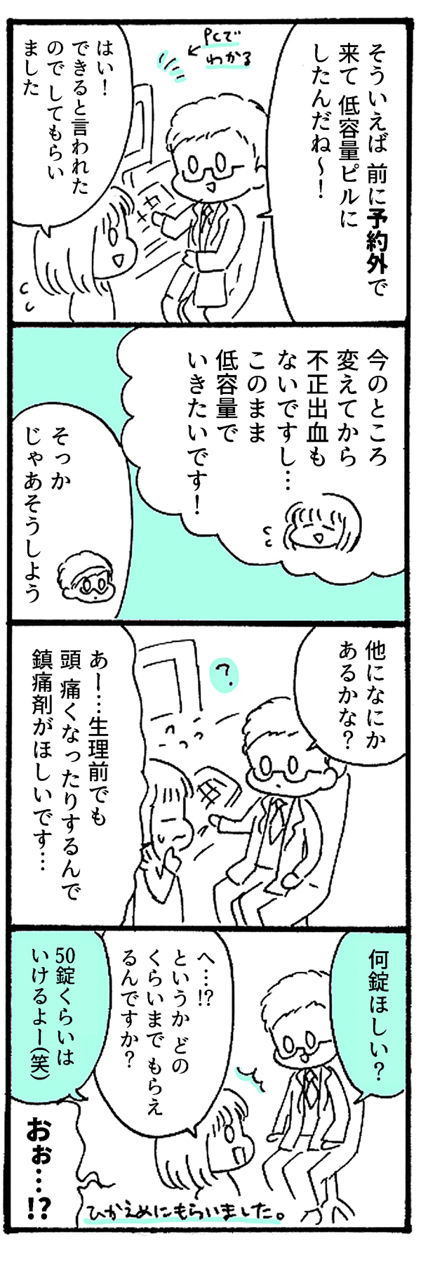 サイゾーウーマンカルチャーマンガ【68回】鎮痛剤、そんなにもらえるの!? カルチャー 【連載】私の生理、「病名」がつきました。~月経困難症、ピルに漢方あれこれ5年試してみたら~ 【マンガ】そんな大量にもらえるの!? 鎮痛剤の処方、先生に頼んでみた結果……【第68回】 2019/05/26 18:00 まお マンガ私の生理、「病名」がつきました。月経困難症 「生理痛なんて、みんな一緒!」 1カ月ごとにやってくる、尋常じゃない腹痛・寒気・吐き気……。 周囲の言葉を信じて10数年も耐え続けた「生理痛」、医者にかかってみたらビョーキと診断されちゃった!? 30歳から治療を開始した「月経困難症」との向き合い方をつづる、日常闘病コミックエッセイ。 そんなに!? ――「私の生理、病名がつきました。」は、日曜のみの更新になります。今後ともお楽しみに! <著者プロフィール> まお 月経困難症。体験した事や思った事を4コマ漫画にしています。自分の体、大切な人の体を考える事や、行動する事のきっかけになればうれしいです。ポジティブに生きてるオタク。 <バックナンバーはこちら> ■第1回~第10回まとめ読み……私の生理、ビョーキでした!? ■第11回~第20回まとめ読み……ピル服用、7カ月の間に起きたこと ■第21回~第30回まとめ読み……ピル服用で「不正出血」が止まらない!? ■第31回~第40回まとめ読み……「生理を知らない成人男性」って実在したの!? ■第41回~第50回まとめ読み……卵巣に「のう腫」が見つかったらどうする? 【第51回】新しい職場で大寝坊! 【第52回】30代で更年期障害!? 【第53回】ピル由来と思しき「新たな症状」 【第54回】3度めの「低容量ピル」 【第55回】「不正出血」が起きたワケ 【第56回】ピルを飲むと太るって本当? 【第57回】「ピル太り」実録レポート! 【第58回】ピル太りに効いたダイエット方法 【第59回】自己管理できない人、じゃない! 【第60回】初めて知った「太った人」の辛さ 【第61回】「心無い言葉」への対処法 【第62回】引越し先、選ぶ基準は○○への距離! 【第63回】半年間で「卵巣のう腫」はどうなった? 【第64回】ピル処方、4度目の転院! 【第65回】はじめての院外処方 【第66回】超・低容量ピルの結果は 【第67回】こんな医者はイヤだ! 最終更新:2019/05/26 18:00 多めにもらってストックしときたい 関連記事 【日雇いマンガ】48話『ピッキングバトル! 熾烈な戦いはB列棚にて……』【マンガ・ヤリマン引退】元・ヤリマンがBLにハマった結果……目に映る男は当然こうなる【第48回】【マンガ・スピリチュアル被害】教祖の上には、また別の“教祖”がいる!【2回】【マンガ・ヤリマン引退】10年ぶり、3度目の離婚! バツ3子持ち、離婚届を提出してみたら【第47回】【毒親マンガ】同棲開始後、実家とアパートを往復する彼。平穏な毎日と思っていたら……【16話】 その他の作品を読む 次の記事 小学校卒業式の「はかま」に賛否 >