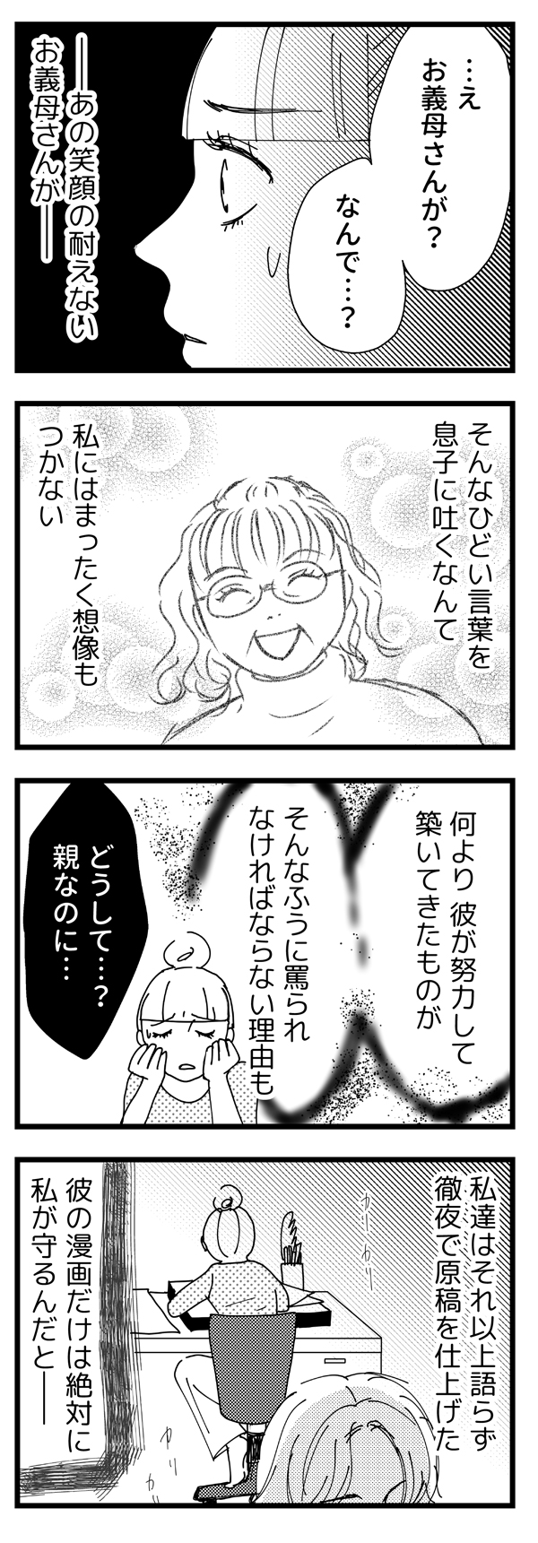 サイゾーウーマンカルチャーマンガ音咲椿『婚約破棄で訴えてやる!~毒親持ち彼氏と167日間壮絶バトル~』【毒親19話】実母に「クズ」と罵られた カルチャー 【マンガ】私の彼が毒親から逃れられない!~婚約破棄で訴えてやる・番外編~ 【毒親マンガ】実母に「クズ」と罵られた彼――そんなひどい言葉を吐くなんて【19話】 2019/06/03 13:00 音咲椿 マンガ毒親音咲椿婚約破棄で訴えてやる! 「君ってなんだか、僕の母に似てるんだよね」――。 イケメン彼氏の「不可解」な婚約破棄と、それに伴う顛末を描いた実録コミックエッセイ 『婚約破棄で訴えてやる!~毒親持ち彼氏と167日間壮絶バトル~』の前日談。 婚約していた彼は、なぜ突然手のひらを返したのか? あんなに嫌悪していたはずの“毒母”側についたのはどうして? 交際していた当時の記憶から あの頃の彼の心理と背景を掘り下げてみると、意外な事実が見えてきた――! なんで? ――『私の彼が毒親から逃れられない!』は毎週月・火更新。お楽しみに! ⇒このマンガへのコメントを読む・書く <バックナンバーはこちら> ■第1回……婚約破棄から10年、残る疑問 ■第2回……彼のママは専業主婦だった ■第3回……「辞表出しといた」って!? ■第4回……我が子にセックス回数を暴露!? ■第5回……実家暮らしだった彼と、恋に落ちるまで ■第6回……彼の誕生日に、何度も電話が……。 ■第7回……彼母の「息子依存」が過剰すぎる? ■第8回……朝4時、彼は電話で謝罪中 ■第9回……バツイチの私、義母からの印象は? ■第10回…いよいよ彼母と初対面の日 ■第11回…初めて会った彼母は……! ■第12回…「過去の彼女」と比較された ■第13回…彼母に受け入れられた……! ■第14回…「君は、僕の母に似てるね」 ■第15回…両家の顔合わせも上々で…? ■第16回…実家とアパートを往復する彼 ■第17回…母に「汚い」って言われたんだ ■第18回…母にエロ原稿を見られた ■前作……『婚約破棄で訴えてやる!』1-3話 *** 前作『婚約破棄で訴えてやる!』は、電子書籍にてすべてご覧いただけます。 ★★★各電子書店にてお買い求めいただけます★★★ 音咲椿(おとさき・つばき) 男性向けグラビア誌編集長を経て、ポット出版社刊「女の子×女の子のためのエロチックブック・Carmilla」にてイラスト・漫画家デビュー。 単行本「イケメン外国人たちとベッドで異文化交流した結果。」(ぶんか社刊)好評発売・配信中。 マンガ「『こんな大きいなんて聞いてない!』~外国人と異文化SEX、ヤりまくりました。」「婚約破棄で訴えてやる!~毒親持ち彼氏と167日間壮絶バトル~」配信中。 音咲椿Twitter(@otosaki6666) 最終更新:2019/06/11 17:12 絶対おかしいよ 関連記事 【マンガ】私の彼が毒親から逃れられない! ~婚約破棄で訴えてやる・番外編~【新連載】【日雇いマンガ】49話『ピッキングバトル2 〜ラスボス! 絶対に〇〇しないオバさん〜』【マンガ・ヤリマン引退】2歳児にして”大物”の気配!? 34歳をアゴで使う「我が子の肝っ玉」【第50回】【マンガ】「財産の四分の一もらう権利はある!!」あの義姉が喚いて大変!【『人生のゴミ』2話】【毒親マンガ】彼の職業はエロマンガ家――母に原稿を見られてしまった!その反応は【18話】 その他の作品を読むバックナンバーを読む 次の記事 嵐・二宮、「結婚式に行かない」理由は? >