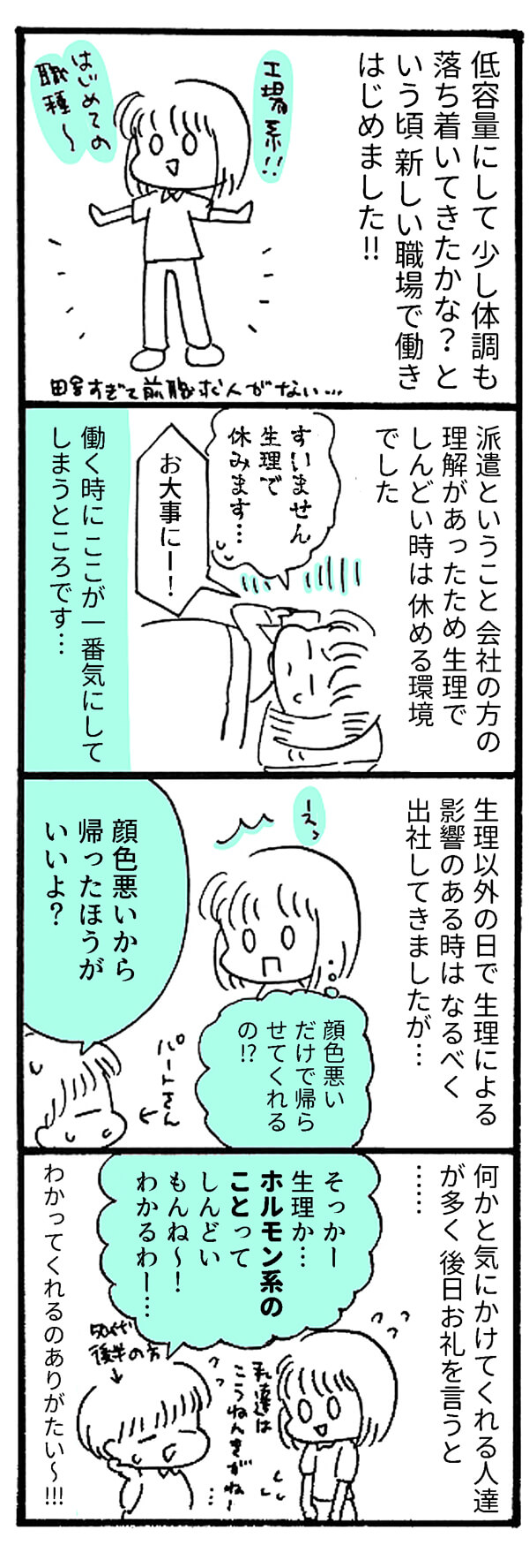 サイゾーウーマンカルチャーマンガ【69回】派遣の条件は「休めること」! カルチャー 【連載】私の生理、「病名」がつきました。~月経困難症、ピルに漢方あれこれ5年試してみたら~ 【マンガ】派遣の条件、最優先は「休めること」! 理解者は大事なんです【第69回】 2019/06/02 19:00 まお マンガ私の生理、「病名」がつきました。月経困難症 「生理痛なんて、みんな一緒!」 1カ月ごとにやってくる、尋常じゃない腹痛・寒気・吐き気……。 周囲の言葉を信じて10数年も耐え続けた「生理痛」、医者にかかってみたらビョーキと診断されちゃった!? 30歳から治療を開始した「月経困難症」との向き合い方をつづる、日常闘病コミックエッセイ。 今度は工場系のおしごと ――「私の生理、病名がつきました。」は、日曜のみの更新になります。今後ともお楽しみに! <著者プロフィール> まお 月経困難症。体験した事や思った事を4コマ漫画にしています。自分の体、大切な人の体を考える事や、行動する事のきっかけになればうれしいです。ポジティブに生きてるオタク。 <バックナンバーはこちら> ■第1回~第10回まとめ読み……私の生理、ビョーキでした!? ■第11回~第20回まとめ読み……ピル服用、7カ月の間に起きたこと ■第21回~第30回まとめ読み……ピル服用で「不正出血」が止まらない!? ■第31回~第40回まとめ読み……「生理を知らない成人男性」って実在したの!? ■第41回~第50回まとめ読み……卵巣に「のう腫」が見つかったらどうする? 【第51回】新しい職場で大寝坊! 【第52回】30代で更年期障害!? 【第53回】ピル由来と思しき「新たな症状」 【第54回】3度めの「低容量ピル」 【第55回】「不正出血」が起きたワケ 【第56回】ピルを飲むと太るって本当? 【第57回】「ピル太り」実録レポート! 【第58回】ピル太りに効いたダイエット方法 【第59回】自己管理できない人、じゃない! 【第60回】初めて知った「太った人」の辛さ 【第61回】「心無い言葉」への対処法 【第62回】引越し先、選ぶ基準は○○への距離! 【第63回】半年間で「卵巣のう腫」はどうなった? 【第64回】ピル処方、4度目の転院! 【第65回】はじめての院外処方 【第66回】超・低容量ピルの結果は 【第67回】こんな医者はイヤだ! 【第68回】鎮痛剤、そんなにもらえるの!? 最終更新:2019/06/02 20:20 理解してもらえるのって、マジでありがたいよね 関連記事 【配信者マンガ】 Twitter画像から「近くに来たぞ」…ネットストーカー恐怖譚!【第31回】【マンガ】外国企業がうちの工房を「買いたい」!? 義姉の話が怪しすぎる!【『人生のゴミ』3話】【日雇いマンガ】49話『ピッキングバトル2 〜ラスボス! 絶対に〇〇しないオバさん〜』【マンガ・ヤリマン引退】2歳児にして”大物”の気配!? 34歳をアゴで使う「我が子の肝っ玉」【第50回】【毒親マンガ】彼の様子がおかしすぎる……「汚い」なんて、誰がそんなことを?【17話】 その他の作品を読む 次の記事 『テラハ』新シーズンレビュー >