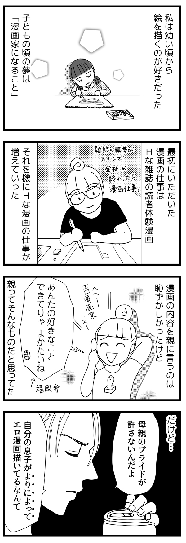 サイゾーウーマンカルチャーマンガ音咲椿『婚約破棄で訴えてやる!~毒親持ち彼氏と167日間壮絶バトル~』【毒親20話】我が子の仕事を否定 カルチャー 【マンガ】私の彼が毒親から逃れられない!~婚約破棄で訴えてやる・番外編~ 【毒親マンガ】我が子の仕事を「よりによって」――夢を応援できない親なんているの?【20話】 2019/06/04 13:00 音咲椿 マンガ毒親音咲椿婚約破棄で訴えてやる! 「君ってなんだか、僕の母に似てるんだよね」――。 イケメン彼氏の「不可解」な婚約破棄と、それに伴う顛末を描いた実録コミックエッセイ 『婚約破棄で訴えてやる!~毒親持ち彼氏と167日間壮絶バトル~』の前日談。 婚約していた彼は、なぜ突然手のひらを返したのか? あんなに嫌悪していたはずの“毒母”側についたのはどうして? 交際していた当時の記憶から あの頃の彼の心理と背景を掘り下げてみると、意外な事実が見えてきた――! 親のあり方 ――『私の彼が毒親から逃れられない!』は毎週月・火更新。お楽しみに! ⇒このマンガへのコメントを読む・書く <バックナンバーはこちら> ■第1回……婚約破棄から10年、残る疑問 ■第2回……彼のママは専業主婦だった ■第3回……「辞表出しといた」って!? ■第4回……我が子にセックス回数を暴露!? ■第5回……実家暮らしだった彼と、恋に落ちるまで ■第6回……彼の誕生日に、何度も電話が……。 ■第7回……彼母の「息子依存」が過剰すぎる? ■第8回……朝4時、彼は電話で謝罪中 ■第9回……バツイチの私、義母からの印象は? ■第10回…いよいよ彼母と初対面の日 ■第11回…初めて会った彼母は……! ■第12回…「過去の彼女」と比較された ■第13回…彼母に受け入れられた……! ■第14回…「君は、僕の母に似てるね」 ■第15回…両家の顔合わせも上々で…? ■第16回…実家とアパートを往復する彼 ■第17回…母に「汚い」って言われたんだ ■第18回…母にエロ原稿を見られた ■第19回…実母に「クズ」と罵られた ■前作……『婚約破棄で訴えてやる!』1-3話 *** 前作『婚約破棄で訴えてやる!』は、電子書籍にてすべてご覧いただけます。 ★★★各電子書店にてお買い求めいただけます★★★ 音咲椿(おとさき・つばき) 男性向けグラビア誌編集長を経て、ポット出版社刊「女の子×女の子のためのエロチックブック・Carmilla」にてイラスト・漫画家デビュー。 単行本「イケメン外国人たちとベッドで異文化交流した結果。」(ぶんか社刊)好評発売・配信中。 マンガ「『こんな大きいなんて聞いてない!』~外国人と異文化SEX、ヤりまくりました。」「婚約破棄で訴えてやる!~毒親持ち彼氏と167日間壮絶バトル~」配信中。 音咲椿Twitter(@otosaki6666) 最終更新:2019/06/11 17:13 心が寒々としてきたわ 関連記事 【マンガ】私の彼が毒親から逃れられない! ~婚約破棄で訴えてやる・番外編~【新連載】【毒親マンガ】実母に「クズ」と罵られた彼――そんなひどい言葉を吐くなんて【19話】【マンガ】派遣の条件、最優先は「休めること」! 理解者は大事なんです【第69回】【配信者マンガ】 Twitter画像から「近くに来たぞ」…ネットストーカー恐怖譚!【第31回】【マンガ】「がんばってる? だから何!?」経営ピンチの家業に義姉がブチ切れ!【『人生のゴミ』最終話】 その他の作品を読むバックナンバーを読む 次の記事 TOKIO・松岡、「ジャニーズでも飯食えない」 >