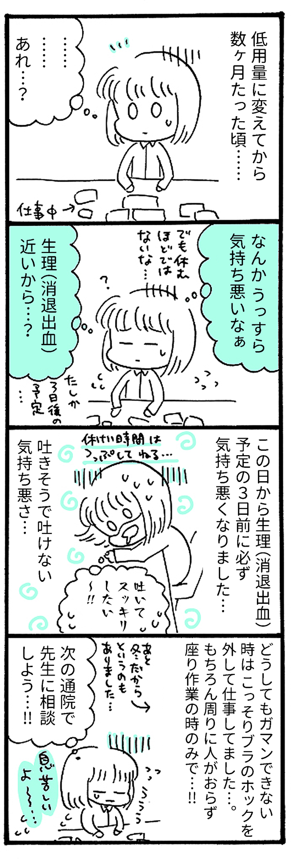 サイゾーウーマンカルチャーマンガ【70回】「謎の吐き気」がやってきた カルチャー 【連載】私の生理、「病名」がつきました。~月経困難症、ピルに漢方あれこれ5年試してみたら~ 【マンガ】ブラのホックを外して仕事!? 「謎の吐き気」がやってきた!【第70回】 2019/06/09 18:00 まお 私の生理、「病名」がつきました。月経困難症マンガ 「生理痛なんて、みんな一緒!」 1カ月ごとにやってくる、尋常じゃない腹痛・寒気・吐き気……。 周囲の言葉を信じて10数年も耐え続けた「生理痛」、医者にかかってみたらビョーキと診断されちゃった!? 30歳から治療を開始した「月経困難症」との向き合い方をつづる、日常闘病コミックエッセイ。 またまた体の変化 ――「私の生理、病名がつきました。」は、毎週日曜更新になります。今後ともお楽しみに! <著者プロフィール> まお 月経困難症。体験した事や思った事を4コマ漫画にしています。自分の体、大切な人の体を考える事や、行動する事のきっかけになればうれしいです。ポジティブに生きてるオタク。 <バックナンバーはこちら> ■第1回~第10回まとめ読み……私の生理、ビョーキでした!? ■第11回~第20回まとめ読み……ピル服用、7カ月の間に起きたこと ■第21回~第30回まとめ読み……ピル服用で「不正出血」が止まらない!? ■第31回~第40回まとめ読み……「生理を知らない成人男性」って実在したの!? ■第41回~第50回まとめ読み……卵巣に「のう腫」が見つかったらどうする? 【第51回】新しい職場で大寝坊! 【第52回】30代で更年期障害!? 【第53回】ピル由来と思しき「新たな症状」 【第54回】3度めの「低容量ピル」 【第55回】「不正出血」が起きたワケ 【第56回】ピルを飲むと太るって本当? 【第57回】「ピル太り」実録レポート! 【第58回】ピル太りに効いたダイエット方法 【第59回】自己管理できない人、じゃない! 【第60回】初めて知った「太った人」の辛さ 【第61回】「心無い言葉」への対処法 【第62回】引越し先、選ぶ基準は○○への距離! 【第63回】半年間で「卵巣のう腫」はどうなった? 【第64回】ピル処方、4度目の転院! 【第65回】はじめての院外処方 【第66回】超・低容量ピルの結果は 【第67回】こんな医者はイヤだ! 【第68回】鎮痛剤、そんなにもらえるの!? 【第69回】派遣の条件は「休めること」! 最終更新:2019/06/09 18:00 ブラの締め付けが耐えがたい時ってある! 関連記事 【マンガ・ヤリマン引退】「シーツ交換」でかくし芸!? あの芸能人が降臨!【第52回】【日雇いマンガ】50話『スメルハラスメント発生! 解決策でさらなる地獄化……』【マンガ・スピリチュアル被害】「ついてる」と1,000回言うだけで幸せになる団体【3回】【マンガ・ヤリマン引退】「オブラートに包んだ発言」を2歳児に教えたらどうなる?【第51回】【毒親マンガ】我が子の仕事を「よりによって」――夢を応援できない親なんているの?【20話】 その他の作品を読む 次の記事 SnowManのCM撮影舞台裏 >