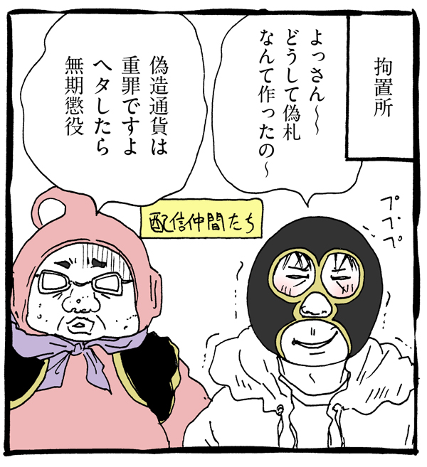 サイゾーウーマンカルチャーマンガあさの☆ひかり『ネット配信で人生が狂った人の裏側ぶっちゃけていいスか!?』【32話】タカリ配信者、ニセ札を使用! カルチャー 【マンガ連載】ネット配信で人生が狂った人の裏側ぶっちゃけていいスか!? 【配信者マンガ】 ある日突然「ニセ札使用」で捕まった!? 「通貨偽造」のコワ~イ話【第32回】 2019/06/08 13:00 あさの☆ひかり マンガあさの☆ひかりネット配信で人生が狂った人の裏側ぶっちゃけていいスか!? 不倫バレ、嫉妬で放火、ニセ札作りに救急車……何度警察のお世話になったって、ぜ~んぶ「配信のネタ」なんです!? マンガ『芸能界の裏側ぶっちゃけていいスか!?』で数々の芸能タブーをぶっちゃけてきた 怖いもの知らずのグラドル漫画家・あさの☆ひかりが、今度はなんと「ネット配信者の世界」を大暴露!! 背景がゴミ屋敷 次のページ なぜ「通貨偽造」かと言うと… 12次のページ 関連記事 【ジャニーズマンガ】掃除のおじさんがヅャニーさん!?【『ヅャニーさん』第80回】【マンガ・ヤリマン引退】「シーツ交換」でかくし芸!? あの芸能人が降臨!【第52回】【日雇いマンガ】50話『スメルハラスメント発生! 解決策でさらなる地獄化……』【マンガ・スピリチュアル被害】「ついてる」と1,000回言うだけで幸せになる団体【3回】【マンガ・ヤリマン引退】「オブラートに包んだ発言」を2歳児に教えたらどうなる?【第51回】 その他の作品を読むバックナンバーを読む