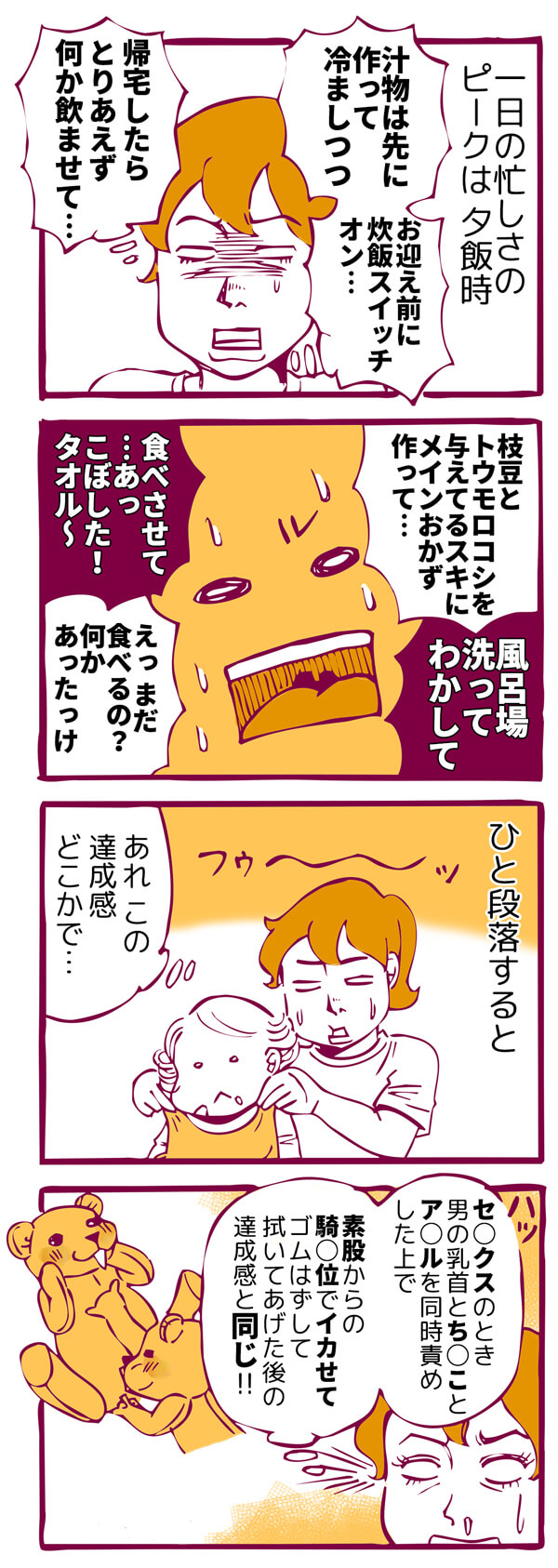 サイゾーウーマンカルチャーマンガ『ヤリマン引退!』1-3話+告知 カルチャー 【連載】ヤリマン引退!~マンを持して育児はじめました~ 【マンガ】ヤリマン引退!~マンを持して育児はじめました~【第1~3話+告知】 2019/06/12 12:30 ドルショック竹下 ヤリマン引退!マンガドルショック竹下 ヤリマン、一児の母になる! 『挿れるモノ拒まず』で話題のマンガ家・ドルショック竹下が綴る、異色の育児コミックエッセイ。 百戦錬磨のテクニックは、ムスメの世話にも応用できる!? *** 本作の電子書籍化にともない、1-3話を再掲いたします。 1話・ヤリマンが育児はじめました 次のページ アッパーな幼児番組 12次のページ 関連記事 【マンガ】ふっくらタイ移住まんが~ブラック企業を辞めたらバンコクでした~【第1話+告知】【マンガ】婚約破棄で訴えてやる!~毒親持ち彼氏と167日間壮絶バトル~【1~3話+告知】【マンガ・ヤリマン引退】「シーツ交換」でかくし芸!? あの芸能人が降臨!【第52回】【マンガ・ヤリマン引退】「オブラートに包んだ発言」を2歳児に教えたらどうなる?【第51回】【マンガ・ヤリマン引退】2歳児にして”大物”の気配!? 34歳をアゴで使う「我が子の肝っ玉」【第50回】 その他の作品を読む
