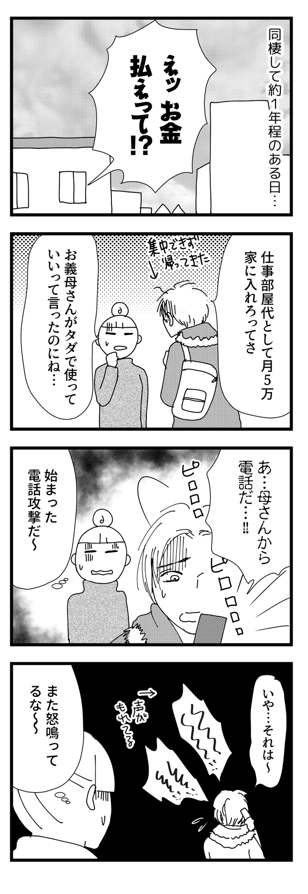 サイゾーウーマンカルチャーマンガ音咲椿『婚約破棄で訴えてやる!~毒親持ち彼氏と167日間壮絶バトル~』【毒親22話】「月5万払え」って!? カルチャー 【マンガ】私の彼が毒親から逃れられない!~婚約破棄で訴えてやる・番外編~ 【毒親マンガ】「月に5万払え」なんて話が違う! 嫌がらせに電話攻撃、疲弊する彼【22話】 2019/06/11 13:00 音咲椿 マンガ毒親音咲椿婚約破棄で訴えてやる! 「君ってなんだか、僕の母に似てるんだよね」――。 イケメン彼氏の「不可解」な婚約破棄と、それに伴う顛末を描いた実録コミックエッセイ 『婚約破棄で訴えてやる!~毒親持ち彼氏と167日間壮絶バトル~』の前日談。 婚約していた彼は、なぜ突然手のひらを返したのか? あんなに嫌悪していたはずの“毒母”側についたのはどうして? 交際していた当時の記憶から あの頃の彼の心理と背景を掘り下げてみると、意外な事実が見えてきた――! 話が違う! ――『私の彼が毒親から逃れられない!』は毎週月・火更新。お楽しみに! ⇒このマンガへのコメントを読む・書く <バックナンバーはこちら> ■第1回……婚約破棄から10年、残る疑問 ■第2回……彼のママは専業主婦だった ■第3回……「辞表出しといた」って!? ■第4回……我が子にセックス回数を暴露!? ■第5回……実家暮らしだった彼と、恋に落ちるまで ■第6回……彼の誕生日に、何度も電話が……。 ■第7回……彼母の「息子依存」が過剰すぎる? ■第8回……朝4時、彼は電話で謝罪中 ■第9回……バツイチの私、義母からの印象は? ■第10回…いよいよ彼母と初対面の日 ■第11回…初めて会った彼母は……! ■第12回…「過去の彼女」と比較された ■第13回…彼母に受け入れられた……! ■第14回…「君は、僕の母に似てるね」 ■第15回…両家の顔合わせも上々で…? ■第16回…実家とアパートを往復する彼 ■第17回…母に「汚い」って言われたんだ ■第18回…母にエロ原稿を見られた ■第19回…実母に「クズ」と罵られた ■第20回…我が子の仕事を否定 ■第21回…彼母の抱える「トラウマ」 ■前作……『婚約破棄で訴えてやる!』1-3話 *** 前作『婚約破棄で訴えてやる!』は、電子書籍にてすべてご覧いただけます。 ★★★各電子書店にてお買い求めいただけます★★★ 音咲椿(おとさき・つばき) 男性向けグラビア誌編集長を経て、ポット出版社刊「女の子×女の子のためのエロチックブック・Carmilla」にてイラスト・漫画家デビュー。 単行本「イケメン外国人たちとベッドで異文化交流した結果。」(ぶんか社刊)好評発売・配信中。 マンガ「『こんな大きいなんて聞いてない!』~外国人と異文化SEX、ヤりまくりました。」「婚約破棄で訴えてやる!~毒親持ち彼氏と167日間壮絶バトル~」配信中。 音咲椿Twitter(@otosaki6666) 最終更新:2019/06/11 17:21 「汚らしい」って罵ったくせに 関連記事 【マンガ】私の彼が毒親から逃れられない! ~婚約破棄で訴えてやる・番外編~【新連載】【マンガ】ブラのホックを外して仕事!? 「謎の吐き気」がやってきた!【第70回】【配信者マンガ】 ある日突然「ニセ札使用」で捕まった!? 「通貨偽造」のコワ~イ話【第32回】【ジャニーズマンガ】掃除のおじさんがヅャニーさん!?【『ヅャニーさん』第80回】【マンガ・ヤリマン引退】「シーツ交換」でかくし芸!? あの芸能人が降臨!【第52回】 その他の作品を読むバックナンバーを読む 次の記事 嵐・二宮、『ガンフェス』出演に緊張のワケ >