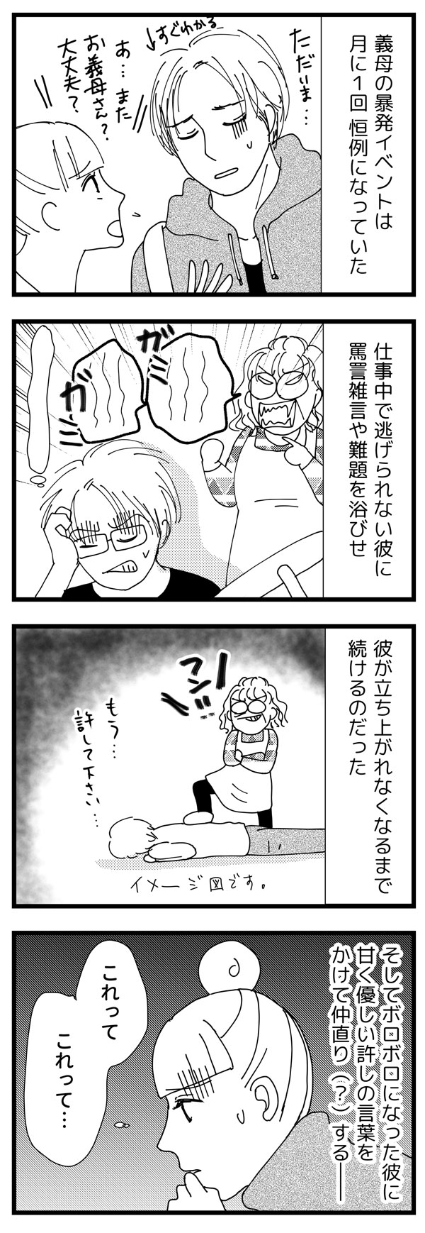 サイゾーウーマンカルチャーマンガ音咲椿『婚約破棄で訴えてやる!~毒親持ち彼氏と167日間壮絶バトル~』【毒親23話】月イチで「毒親被害」 カルチャー 【マンガ】私の彼が毒親から逃れられない!~婚約破棄で訴えてやる・番外編~ 【毒親マンガ】月イチで「毒親被害」に遭う彼――四六時中、暴言を浴びせられ【23話】 2019/06/17 13:00 音咲椿 マンガ毒親音咲椿婚約破棄で訴えてやる! 「君ってなんだか、僕の母に似てるんだよね」――。 イケメン彼氏の「不可解」な婚約破棄と、それに伴う顛末を描いた実録コミックエッセイ 『婚約破棄で訴えてやる!~毒親持ち彼氏と167日間壮絶バトル~』の前日談。 婚約していた彼は、なぜ突然手のひらを返したのか? あんなに嫌悪していたはずの“毒母”側についたのはどうして? 交際していた当時の記憶から あの頃の彼の心理と背景を掘り下げてみると、意外な事実が見えてきた――! 月イチで暴発 ――『私の彼が毒親から逃れられない!』は毎週月・火更新。お楽しみに! ⇒このマンガへのコメントを読む・書く <バックナンバーはこちら> ■第1回……婚約破棄から10年、残る疑問 ■第2回……彼のママは専業主婦だった ■第3回……「辞表出しといた」って!? ■第4回……我が子にセックス回数を暴露!? ■第5回……実家暮らしだった彼と、恋に落ちるまで ■第6回……彼の誕生日に、何度も電話が……。 ■第7回……彼母の「息子依存」が過剰すぎる? ■第8回……朝4時、彼は電話で謝罪中 ■第9回……バツイチの私、義母からの印象は? ■第10回…いよいよ彼母と初対面の日 ■第11回…初めて会った彼母は……! ■第12回…「過去の彼女」と比較された ■第13回…彼母に受け入れられた……! ■第14回…「君は、僕の母に似てるね」 ■第15回…両家の顔合わせも上々で…? ■第16回…実家とアパートを往復する彼 ■第17回…母に「汚い」って言われたんだ ■第18回…母にエロ原稿を見られた ■第19回…実母に「クズ」と罵られた ■第20回…我が子の仕事を否定 ■第21回…彼母の抱える「トラウマ」 ■第22回…「月5万払え」って!? ■前作……『婚約破棄で訴えてやる!』1-3話 *** 前作『婚約破棄で訴えてやる!』は、電子書籍にてすべてご覧いただけます。 ★★★各電子書店にてお買い求めいただけます★★★ 音咲椿(おとさき・つばき) 男性向けグラビア誌編集長を経て、ポット出版社刊「女の子×女の子のためのエロチックブック・Carmilla」にてイラスト・漫画家デビュー。 単行本「イケメン外国人たちとベッドで異文化交流した結果。」(ぶんか社刊)好評発売・配信中。 マンガ「『こんな大きいなんて聞いてない!』~外国人と異文化SEX、ヤりまくりました。」「婚約破棄で訴えてやる!~毒親持ち彼氏と167日間壮絶バトル~」配信中。 音咲椿Twitter(@otosaki6666) 最終更新:2019/06/18 13:49 仕事部屋に入ってきてまで!? 関連記事 【マンガ】私の彼が毒親から逃れられない! ~婚約破棄で訴えてやる・番外編~【新連載】【マンガ】えっ、私の症状が「PMS」!? なんで気付かなかったんだろう【第71回】【マンガ】ネット配信で人生が狂った人の裏側ぶっちゃけていいスか!?【29~32話・まとめ読み】【マンガ・ヤリマン引退】デパートの屋上で、娘が父子を”逆ナンパ”!?【第53回】【日雇いマンガ】51話『働きたくない! なにもしたくない! そんな時どうする……?』 その他の作品を読むバックナンバーを読む 次の記事 関ジャニ∞・横山、「村上のギャラ知りたい」 >