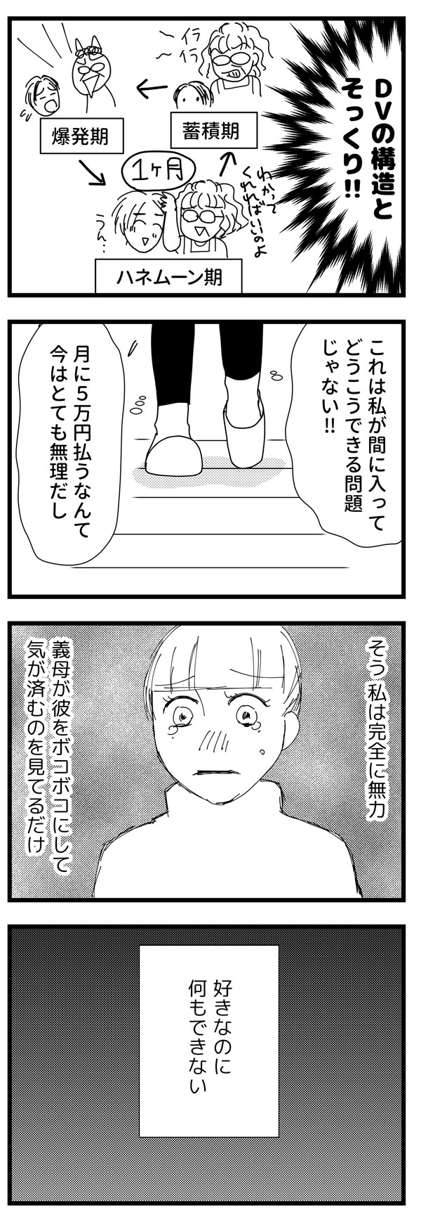 サイゾーウーマンカルチャーマンガ音咲椿『婚約破棄で訴えてやる!~毒親持ち彼氏と167日間壮絶バトル~』【毒親24話】DVの構造そっくり! カルチャー 【マンガ】私の彼が毒親から逃れられない!~婚約破棄で訴えてやる・番外編~ 【毒親マンガ】彼母の行為は「DVの構造そっくり」!叩きのめされる彼に、私は…【24話】 2019/06/18 13:00 音咲椿 マンガ毒親音咲椿婚約破棄で訴えてやる! 「君ってなんだか、僕の母に似てるんだよね」――。 イケメン彼氏の「不可解」な婚約破棄と、それに伴う顛末を描いた実録コミックエッセイ 『婚約破棄で訴えてやる!~毒親持ち彼氏と167日間壮絶バトル~』の前日談。 婚約していた彼は、なぜ突然手のひらを返したのか? あんなに嫌悪していたはずの“毒母”側についたのはどうして? 交際していた当時の記憶から あの頃の彼の心理と背景を掘り下げてみると、意外な事実が見えてきた――! DVの構造 ――『私の彼が毒親から逃れられない!』は毎週月・火更新。お楽しみに! ⇒このマンガへのコメントを読む・書く <バックナンバーはこちら> ■第1回……婚約破棄から10年、残る疑問 ■第2回……彼のママは専業主婦だった ■第3回……「辞表出しといた」って!? ■第4回……我が子にセックス回数を暴露!? ■第5回……実家暮らしだった彼と、恋に落ちるまで ■第6回……彼の誕生日に、何度も電話が……。 ■第7回……彼母の「息子依存」が過剰すぎる? ■第8回……朝4時、彼は電話で謝罪中 ■第9回……バツイチの私、義母からの印象は? ■第10回…いよいよ彼母と初対面の日 ■第11回…初めて会った彼母は……! ■第12回…「過去の彼女」と比較された ■第13回…彼母に受け入れられた……! ■第14回…「君は、僕の母に似てるね」 ■第15回…両家の顔合わせも上々で…? ■第16回…実家とアパートを往復する彼 ■第17回…母に「汚い」って言われたんだ ■第18回…母にエロ原稿を見られた ■第19回…実母に「クズ」と罵られた ■第20回…我が子の仕事を否定 ■第21回…彼母の抱える「トラウマ」 ■第22回…「月5万払え」って!? ■第23回…月イチで「毒親被害」に遭う彼 ■前作……『婚約破棄で訴えてやる!』1-3話 *** 前作『婚約破棄で訴えてやる!』は、電子書籍にてすべてご覧いただけます。 ★★★各電子書店にてお買い求めいただけます★★★ 音咲椿(おとさき・つばき) 男性向けグラビア誌編集長を経て、ポット出版社刊「女の子×女の子のためのエロチックブック・Carmilla」にてイラスト・漫画家デビュー。 単行本「イケメン外国人たちとベッドで異文化交流した結果。」(ぶんか社刊)好評発売・配信中。 マンガ「『こんな大きいなんて聞いてない!』~外国人と異文化SEX、ヤりまくりました。」「婚約破棄で訴えてやる!~毒親持ち彼氏と167日間壮絶バトル~」配信中。 音咲椿Twitter(@otosaki6666) 最終更新:2019/06/18 13:46 何もできないのがつらい 関連記事 【マンガ】私の彼が毒親から逃れられない! ~婚約破棄で訴えてやる・番外編~【新連載】【マンガ】えっ、私の症状が「PMS」!? なんで気付かなかったんだろう【第71回】【マンガ】ネット配信で人生が狂った人の裏側ぶっちゃけていいスか!?【29~32話・まとめ読み】【マンガ・ヤリマン引退】デパートの屋上で、娘が父子を”逆ナンパ”!?【第53回】【日雇いマンガ】51話『働きたくない! なにもしたくない! そんな時どうする……?』 その他の作品を読むバックナンバーを読む 次の記事 嵐・二宮、小泉孝太郎からBDメッセージ >