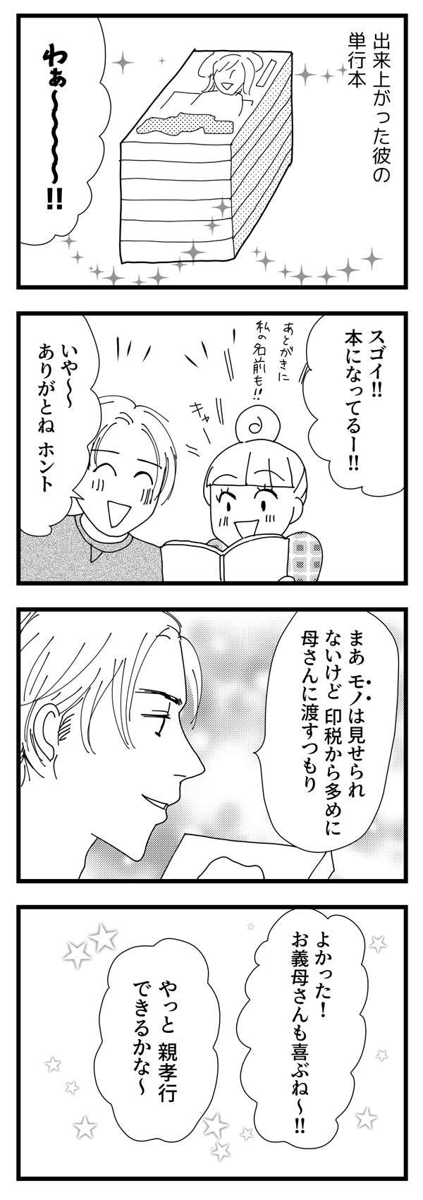 サイゾーウーマンカルチャーマンガ音咲椿『婚約破棄で訴えてやる!~毒親持ち彼氏と167日間壮絶バトル~』【毒親26話】印税が入ってくる! カルチャー 【マンガ】私の彼が毒親から逃れられない!~婚約破棄で訴えてやる・番外編~ 【毒親マンガ】印税が入ってくる!!「これで親孝行できるかな」彼の思いは…【26話】 2019/06/25 13:00 音咲椿 マンガ毒親音咲椿婚約破棄で訴えてやる! 「君ってなんだか、僕の母に似てるんだよね」――。 イケメン彼氏の「不可解」な婚約破棄と、それに伴う顛末を描いた実録コミックエッセイ 『婚約破棄で訴えてやる!~毒親持ち彼氏と167日間壮絶バトル~』の前日談。 婚約していた彼は、なぜ突然手のひらを返したのか? あんなに嫌悪していたはずの“毒母”側についたのはどうして? 交際していた当時の記憶から あの頃の彼の心理と背景を掘り下げてみると、意外な事実が見えてきた――! 本になってる! ――『私の彼が毒親から逃れられない!』は毎週月・火更新。お楽しみに! ⇒このマンガへのコメントを読む・書く <バックナンバーはこちら> ■第1回……婚約破棄から10年、残る疑問 ■第2回……彼のママは専業主婦だった ■第3回……「辞表出しといた」って!? ■第4回……我が子にセックス回数を暴露!? ■第5回……実家暮らしだった彼と、恋に落ちるまで ■第6回……彼の誕生日に、何度も電話が……。 ■第7回……彼母の「息子依存」が過剰すぎる? ■第8回……朝4時、彼は電話で謝罪中 ■第9回……バツイチの私、義母からの印象は? ■第10回…いよいよ彼母と初対面の日 ■第11回…初めて会った彼母は……! ■第12回…「過去の彼女」と比較された ■第13回…彼母に受け入れられた……! ■第14回…「君は、僕の母に似てるね」 ■第15回…両家の顔合わせも上々で…? ■第16回…実家とアパートを往復する彼 ■第17回…母に「汚い」って言われたんだ ■第18回…母にエロ原稿を見られた ■第19回…実母に「クズ」と罵られた ■第20回…我が子の仕事を否定 ■第21回…彼母の抱える「トラウマ」 ■第22回…「月5万払え」って!? ■第23回…月イチで「毒親被害」に遭う彼 ■第24回…DVの構造そっくり! ■第25回…彼の努力が報われた! ■前作……『婚約破棄で訴えてやる!』1-3話 *** 前作『婚約破棄で訴えてやる!』は、電子書籍にてすべてご覧いただけます。 ★★★各電子書店にてお買い求めいただけます★★★ 音咲椿(おとさき・つばき) 男性向けグラビア誌編集長を経て、ポット出版社刊「女の子×女の子のためのエロチックブック・Carmilla」にてイラスト・漫画家デビュー。 単行本「イケメン外国人たちとベッドで異文化交流した結果。」(ぶんか社刊)好評発売・配信中。 マンガ「『こんな大きいなんて聞いてない!』~外国人と異文化SEX、ヤりまくりました。」「婚約破棄で訴えてやる!~毒親持ち彼氏と167日間壮絶バトル~」配信中。 音咲椿Twitter(@otosaki6666) 最終更新:2019/06/25 13:00 親には喜んでほしいよね 関連記事 【マンガ】私の彼が毒親から逃れられない! ~婚約破棄で訴えてやる・番外編~【新連載】【毒親マンガ】彼の努力が報われた!! 義母も喜んでくれるよね?【25話】【マンガ】知らなかった!漢方薬に「正しい飲み方」があったなんて【第72回】【配信者マンガ】電話の相手は「意外な人物」!? 凸待ち配信でリスナーと直電!【第33回】【マンガ・ヤリマン引退】お下品ママ、トンデモ失言! 血の気が引いた「朝のあいさつ」【第55回】 その他の作品を読むバックナンバーを読む 次の記事 関ジャニ∞・大倉、ダンスチームに入る!? >