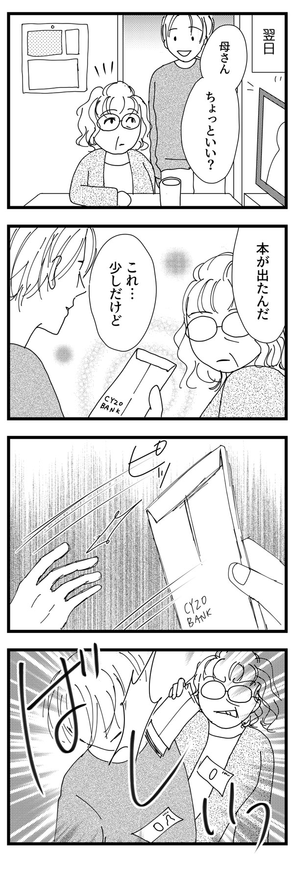 サイゾーウーマンカルチャーマンガ音咲椿『婚約破棄で訴えてやる!~毒親持ち彼氏と167日間壮絶バトル~』【毒親27話】印税を毒母に渡したら カルチャー 【マンガ】私の彼が毒親から逃れられない!~婚約破棄で訴えてやる・番外編~ 【毒親マンガ】「僕の本が出たんだよ」初めての印税、母に渡そうとしたら……【27話】 2019/07/01 13:30 音咲椿 マンガ毒親音咲椿婚約破棄で訴えてやる! 「君ってなんだか、僕の母に似てるんだよね」――。 イケメン彼氏の「不可解」な婚約破棄と、それに伴う顛末を描いた実録コミックエッセイ 『婚約破棄で訴えてやる!~毒親持ち彼氏と167日間壮絶バトル~』の前日談。 婚約していた彼は、なぜ突然手のひらを返したのか? あんなに嫌悪していたはずの“毒母”側についたのはどうして? 交際していた当時の記憶から あの頃の彼の心理と背景を掘り下げてみると、意外な事実が見えてきた――! ちょっといい? ――『私の彼が毒親から逃れられない!』は毎週月・火更新。お楽しみに! ⇒このマンガへのコメントを読む・書く <バックナンバーはこちら> ■第1回……婚約破棄から10年、残る疑問 ■第2回……彼のママは専業主婦だった ■第3回……「辞表出しといた」って!? ■第4回……我が子にセックス回数を暴露!? ■第5回……実家暮らしだった彼と、恋に落ちるまで ■第6回……彼の誕生日に、何度も電話が……。 ■第7回……彼母の「息子依存」が過剰すぎる? ■第8回……朝4時、彼は電話で謝罪中 ■第9回……バツイチの私、義母からの印象は? ■第10回…いよいよ彼母と初対面の日 ■第11回…初めて会った彼母は……! ■第12回…「過去の彼女」と比較された ■第13回…彼母に受け入れられた……! ■第14回…「君は、僕の母に似てるね」 ■第15回…両家の顔合わせも上々で…? ■第16回…実家とアパートを往復する彼 ■第17回…母に「汚い」って言われたんだ ■第18回…母にエロ原稿を見られた ■第19回…実母に「クズ」と罵られた ■第20回…我が子の仕事を否定 ■第21回…彼母の抱える「トラウマ」 ■第22回…「月5万払え」って!? ■第23回…月イチで「毒親被害」に遭う彼 ■第24回…DVの構造そっくり! ■第25回…彼の努力が報われた! ■第26回…印税が入ってくる! ■前作……『婚約破棄で訴えてやる!』1-3話 *** 前作『婚約破棄で訴えてやる!』は、電子書籍にてすべてご覧いただけます。 ★★★各電子書店にてお買い求めいただけます★★★ 音咲椿(おとさき・つばき) 男性向けグラビア誌編集長を経て、ポット出版社刊「女の子×女の子のためのエロチックブック・Carmilla」にてイラスト・漫画家デビュー。 単行本「イケメン外国人たちとベッドで異文化交流した結果。」(ぶんか社刊)好評発売・配信中。 マンガ「『こんな大きいなんて聞いてない!』~外国人と異文化SEX、ヤりまくりました。」「婚約破棄で訴えてやる!~毒親持ち彼氏と167日間壮絶バトル~」配信中。 音咲椿Twitter(@otosaki6666) 最終更新:2019/07/01 13:39 えっ…なんで??? 関連記事 【マンガ】私の彼が毒親から逃れられない! ~婚約破棄で訴えてやる・番外編~【新連載】【マンガ】漢方薬には「白湯」がいい! 毎朝飲み続けていたら思わぬツッコミ!?【第73回】【配信者マンガ】32万円の「ダッチワイフ」ガチ購入! 初夜をレポートしてみたら【第34回】【マンガ・ヤリマン引退】ぞうさん型の「ヌルヌルしたオモチャ」どう洗う?【第57回】【日雇いマンガ】53話『刺激たっぷり!? ピュアボーイが赤面するオトナな現場』 その他の作品を読むバックナンバーを読む 次の記事 嵐・二宮『ニノさん』、出演者に批判 >