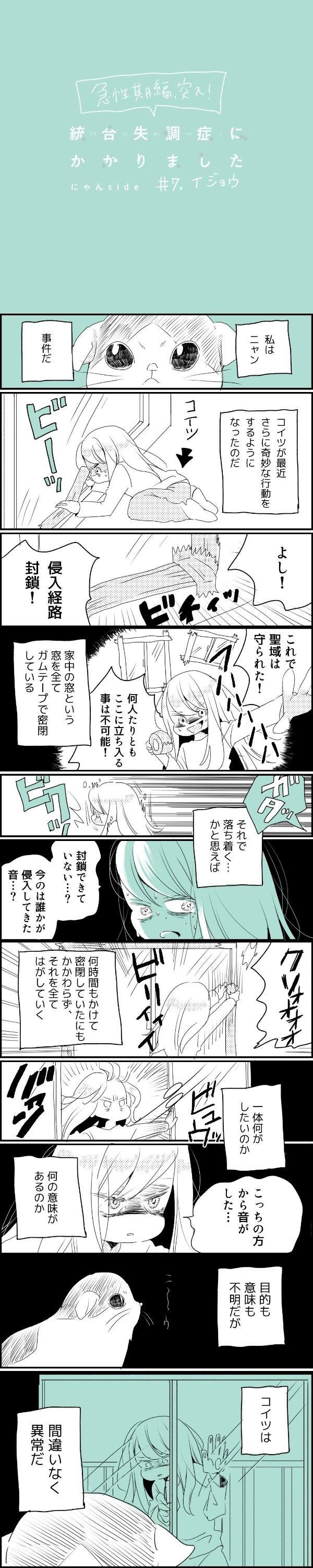 サイゾーウーマンカルチャーマンガさいこ『統合失調症にかかりました~にゃんside〜』【7話】止まらない異常行動 カルチャー 【エッセイマンガ】さいこ『統合失調症にかかりました〜ニャンサイド〜』 【エッセイマンガ】統合失調症にかかりました~にゃんside〜【7話・イジョウ】 2019/07/17 17:00 さいこ マンガさいこ統合失調症にかかりました〜にゃんside〜 サイゾーウーマンにて連載していた、自身の統合失調症の発症から社会復帰までを描いた闘病エッセイマンガ『統合失調症にかかりました』(著:さいこ)。今回、飼い猫の視点から病気を振り返る特別編がスタート。 猫から見た、人間の“生き辛さ”とは……。 【過去話はこちらから】 第7話『イジョウ』 ©さいこ ー次回8話は7月24日(水)更新予定です。 【前作『統合失調症にかかりました』はこちらから】 自己紹介編 まとめ前編1~9話/まとめ後編10~18話 19話/20話/21話/22話/23話/24話/25話/26話/27話/28話/29話/30話/31話/32話/最終話 ※本作品は個人の経験に基づいたものです。統合失調症の症状もあくまでもその一部であり、絶対ではありません。個人差がありますことをご理解ください。 さいこ/@s_______ic インスタグラムにて、統合失調症にかかった自身の体験マンガを日々投稿。 https://www.instagram.com/s_______ic/ 最終更新:2019/07/17 17:00 誰か止めて 関連記事 【エッセイマンガ】統合失調症にかかりました~ニャンサイド〜【新連載】【エッセイマンガ】統合失調症にかかりました~ニャンサイド〜【2話・マエブレ】【エッセイマンガ】統合失調症にかかりました~にゃんside〜【3話・コメソウドウ】【エッセイマンガ】統合失調症にかかりました~にゃんside〜【4話・フテキゴウ】【エッセイマンガ】統合失調症にかかりました~にゃんside〜【5話・ザイタク】 その他の作品を読む 次の記事 三浦春馬『TWO WEEKS』、初回8.4%の爆死! >