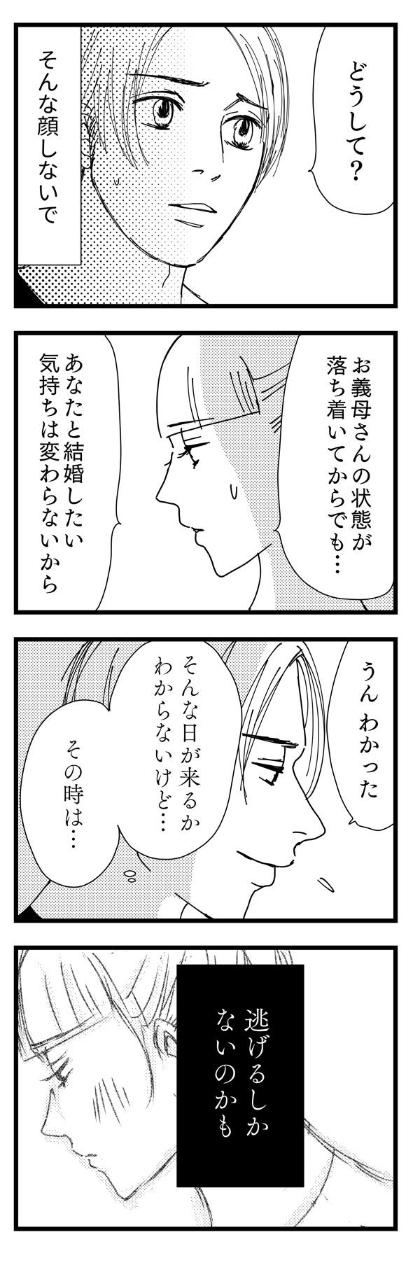 サイゾーウーマンカルチャーマンガ音咲椿『婚約破棄で訴えてやる!~毒親持ち彼氏と167日間壮絶バトル~』【毒親33話】プロポーズを"延期" カルチャー 【マンガ】私の彼が毒親から逃れられない!~婚約破棄で訴えてやる・番外編~ 【毒親マンガ】彼からのプロポーズを”延期”した私――その真意は【33話】 2019/07/22 14:00 音咲椿 マンガ毒親音咲椿婚約破棄で訴えてやる! 「君ってなんだか、僕の母に似てるんだよね」――。 イケメン彼氏の「不可解」な婚約破棄と、それに伴う顛末を描いた実録コミックエッセイ 『婚約破棄で訴えてやる!~毒親持ち彼氏と167日間壮絶バトル~』の前日談。 婚約していた彼は、なぜ突然手のひらを返したのか? あんなに嫌悪していたはずの“毒母”側についたのはどうして? 交際していた当時の記憶から あの頃の彼の心理と背景を掘り下げてみると、意外な事実が見えてきた――! そんな顔しないで ――『私の彼が毒親から逃れられない!』は毎週月・火更新。お楽しみに! ⇒このマンガへのコメントを読む・書く <バックナンバーはこちら> ■第1回……婚約破棄から10年、残る疑問 ■第2回……彼のママは専業主婦だった ■第3回……「辞表出しといた」って!? ■第4回……我が子にセックス回数を暴露!? ■第5回……実家暮らしだった彼と、恋に落ちるまで ■第6回……彼の誕生日に、何度も電話が……。 ■第7回……彼母の「息子依存」が過剰すぎる? ■第8回……朝4時、彼は電話で謝罪中 ■第9回……バツイチの私、義母からの印象は? ■第10回…いよいよ彼母と初対面の日 ■第11回…初めて会った彼母は……! ■第12回…「過去の彼女」と比較された ■第13回…彼母に受け入れられた……! ■第14回…「君は、僕の母に似てるね」 ■第15回…両家の顔合わせも上々で…? ■第16回…実家とアパートを往復する彼 ■第17回…母に「汚い」って言われたんだ ■第18回…母にエロ原稿を見られた ■第19回…実母に「クズ」と罵られた ■第20回…我が子の仕事を否定 ■第21回…彼母の抱える「トラウマ」 ■第22回…「月5万払え」って!? ■第23回…月イチで「毒親被害」に遭う彼 ■第24回…DVの構造そっくり! ■第25回…彼の努力が報われた! ■第26回…印税が入ってくる! ■第27回…印税を毒母に渡したら ■第28回…「恥知らず」の「汚れたカネ」 ■第29回…彼母は普通の親じゃない? ■第30回…もう逃げるしかないね ■第31回…彼母は更年期障害? ■第32回…プロポーズに喜べない ■前作……『婚約破棄で訴えてやる!』1-3話 *** 前作『婚約破棄で訴えてやる!』は、電子書籍にてすべてご覧いただけます。 ★★★各電子書店にてお買い求めいただけます★★★ 音咲椿(おとさき・つばき) 男性向けグラビア誌編集長を経て、ポット出版社刊「女の子×女の子のためのエロチックブック・Carmilla」にてイラスト・漫画家デビュー。 単行本「イケメン外国人たちとベッドで異文化交流した結果。」(ぶんか社刊)好評発売・配信中。 マンガ「『こんな大きいなんて聞いてない!』~外国人と異文化SEX、ヤりまくりました。」「婚約破棄で訴えてやる!~毒親持ち彼氏と167日間壮絶バトル~」配信中。 音咲椿Twitter(@otosaki6666) 最終更新:2019/07/22 14:03 結婚の前に、課題があるからね 関連記事 【マンガ】私の彼が毒親から逃れられない! ~婚約破棄で訴えてやる・番外編~【新連載】【マンガ】元スタッフが暴露……漢方薬の「ヤバすぎる中身」!【第74回】【配信者マンガ】「会いたいです」視聴者からの珍しい要望――彼は「末期がん」だった【第35回】【マンガ】主婦が「一攫千金」やってみた!~宝石掘ってスリランカ(と家計)を救う予定~【新連載】【マンガ・ヤリマン引退】お尻がビショビショになるのって、なんでかな?【第62回】 その他の作品を読むバックナンバーを読む 次の記事 関ジャニ∞・安田の告白にファン衝撃 >