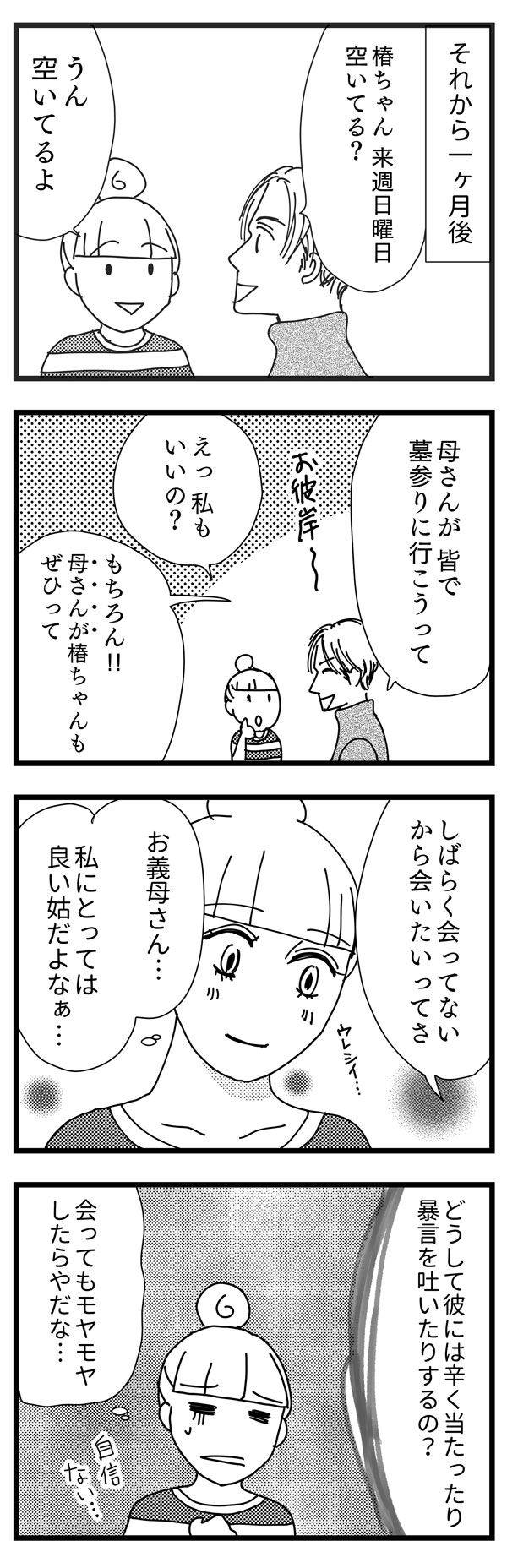 サイゾーウーマンカルチャーマンガ音咲椿『婚約破棄で訴えてやる!~毒親持ち彼氏と167日間壮絶バトル~』【毒親34話】彼母と一緒にお墓参り カルチャー 【マンガ】私の彼が毒親から逃れられない!~婚約破棄で訴えてやる・番外編~ 【毒親マンガ】「私にとっては良い姑なのに…?」お彼岸、お墓参りのお誘いでモヤモヤ【34話】 2019/07/23 13:00 音咲椿 マンガ毒親音咲椿婚約破棄で訴えてやる! 「君ってなんだか、僕の母に似てるんだよね」――。 イケメン彼氏の「不可解」な婚約破棄と、それに伴う顛末を描いた実録コミックエッセイ 『婚約破棄で訴えてやる!~毒親持ち彼氏と167日間壮絶バトル~』の前日談。 婚約していた彼は、なぜ突然手のひらを返したのか? あんなに嫌悪していたはずの“毒母”側についたのはどうして? 交際していた当時の記憶から あの頃の彼の心理と背景を掘り下げてみると、意外な事実が見えてきた――! お彼岸 ――『私の彼が毒親から逃れられない!』は毎週月・火更新。お楽しみに! ⇒このマンガへのコメントを読む・書く <バックナンバーはこちら> ■第1回……婚約破棄から10年、残る疑問 ■第2回……彼のママは専業主婦だった ■第3回……「辞表出しといた」って!? ■第4回……我が子にセックス回数を暴露!? ■第5回……実家暮らしだった彼と、恋に落ちるまで ■第6回……彼の誕生日に、何度も電話が……。 ■第7回……彼母の「息子依存」が過剰すぎる? ■第8回……朝4時、彼は電話で謝罪中 ■第9回……バツイチの私、義母からの印象は? ■第10回…いよいよ彼母と初対面の日 ■第11回…初めて会った彼母は……! ■第12回…「過去の彼女」と比較された ■第13回…彼母に受け入れられた……! ■第14回…「君は、僕の母に似てるね」 ■第15回…両家の顔合わせも上々で…? ■第16回…実家とアパートを往復する彼 ■第17回…母に「汚い」って言われたんだ ■第18回…母にエロ原稿を見られた ■第19回…実母に「クズ」と罵られた ■第20回…我が子の仕事を否定 ■第21回…彼母の抱える「トラウマ」 ■第22回…「月5万払え」って!? ■第23回…月イチで「毒親被害」に遭う彼 ■第24回…DVの構造そっくり! ■第25回…彼の努力が報われた! ■第26回…印税が入ってくる! ■第27回…印税を毒母に渡したら ■第28回…「恥知らず」の「汚れたカネ」 ■第29回…彼母は普通の親じゃない? ■第30回…もう逃げるしかないね ■第31回…彼母は更年期障害? ■第32回…プロポーズに喜べない ■第33回…プロポーズを”延期” ■前作……『婚約破棄で訴えてやる!』1-3話 *** 前作『婚約破棄で訴えてやる!』は、電子書籍にてすべてご覧いただけます。 ★★★各電子書店にてお買い求めいただけます★★★ 音咲椿(おとさき・つばき) 男性向けグラビア誌編集長を経て、ポット出版社刊「女の子×女の子のためのエロチックブック・Carmilla」にてイラスト・漫画家デビュー。 単行本「イケメン外国人たちとベッドで異文化交流した結果。」(ぶんか社刊)好評発売・配信中。 マンガ「『こんな大きいなんて聞いてない!』~外国人と異文化SEX、ヤりまくりました。」「婚約破棄で訴えてやる!~毒親持ち彼氏と167日間壮絶バトル~」配信中。 音咲椿Twitter(@otosaki6666) 最終更新:2019/07/23 13:00 椿ちゃんが見てるのは外面かしら 関連記事 【マンガ】私の彼が毒親から逃れられない! ~婚約破棄で訴えてやる・番外編~【新連載】【毒親マンガ】彼からのプロポーズを”延期”した私――その真意は【33話】【マンガ】スリランカ「連続爆破テロ」現地レポート! 民衆パニックで起きたこと【1-2】【マンガ】主婦が「一攫千金」やってみた!~宝石掘ってスリランカ(と家計)を救う予定~【新連載】【毒親マンガ】更年期障害? ホルモンのせい? 案じる私に、彼の意外すぎる「返答」【31話】 その他の作品を読むバックナンバーを読む 次の記事 TOKIO・松岡、後輩との番組共演振り返る >