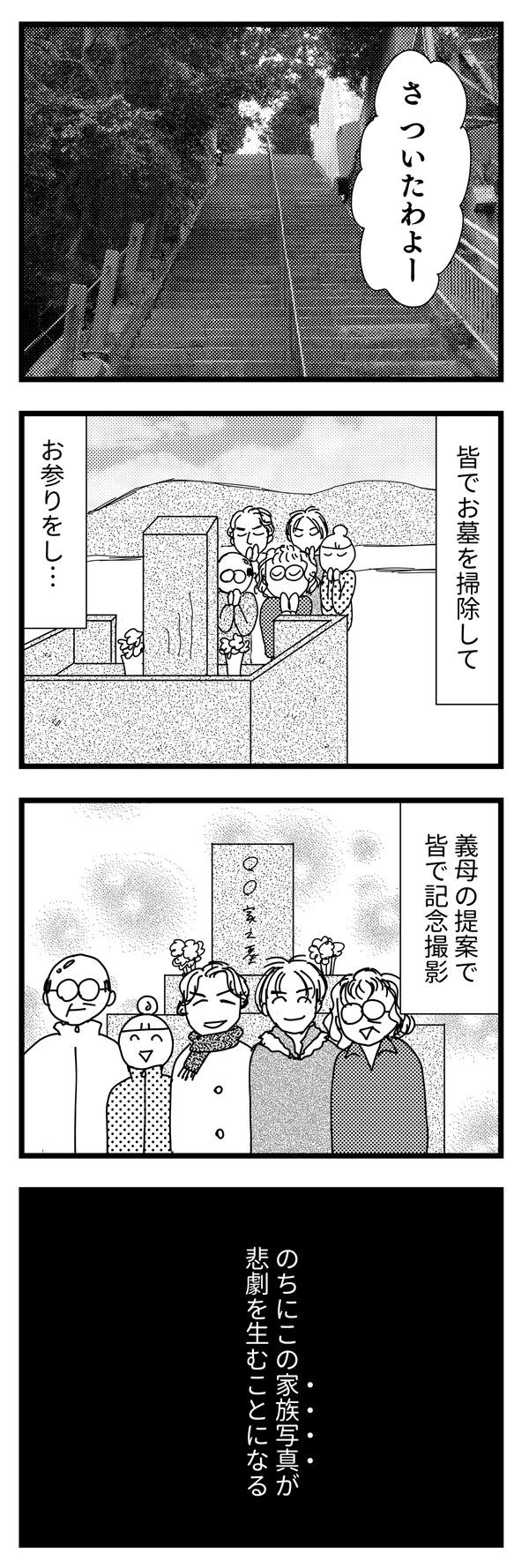 サイゾーウーマンカルチャーマンガ音咲椿『婚約破棄で訴えてやる!~毒親持ち彼氏と167日間壮絶バトル~』【毒親37話】お彼岸に「お墓で写真」 カルチャー 【マンガ】私の彼が毒親から逃れられない!~婚約破棄で訴えてやる・番外編~ 【毒親マンガ】お彼岸、「家族」で一緒に記念撮影――のちに悲劇を生むなんて【37話】 2019/08/05 13:00 音咲椿 マンガ毒親音咲椿婚約破棄で訴えてやる! 「君ってなんだか、僕の母に似てるんだよね」――。 イケメン彼氏の「不可解」な婚約破棄と、それに伴う顛末を描いた実録コミックエッセイ 『婚約破棄で訴えてやる!~毒親持ち彼氏と167日間壮絶バトル~』の前日談。 婚約していた彼は、なぜ突然手のひらを返したのか? あんなに嫌悪していたはずの“毒母”側についたのはどうして? 交際していた当時の記憶から あの頃の彼の心理と背景を掘り下げてみると、意外な事実が見えてきた――! 「家族」のお墓で写真 ――『私の彼が毒親から逃れられない!』は毎週月・火更新。お楽しみに! ⇒このマンガへのコメントを読む・書く <バックナンバーはこちら> ■第1回……婚約破棄から10年、残る疑問 ■第2回……彼のママは専業主婦だった ■第3回……「辞表出しといた」って!? ■第4回……我が子にセックス回数を暴露!? ■第5回……実家暮らしだった彼と、恋に落ちるまで ■第6回……彼の誕生日に、何度も電話が……。 ■第7回……彼母の「息子依存」が過剰すぎる? ■第8回……朝4時、彼は電話で謝罪中 ■第9回……バツイチの私、義母からの印象は? ■第10回…いよいよ彼母と初対面の日 ■第11回…初めて会った彼母は……! ■第12回…「過去の彼女」と比較された ■第13回…彼母に受け入れられた……! ■第14回…「君は、僕の母に似てるね」 ■第15回…両家の顔合わせも上々で…? ■第16回…実家とアパートを往復する彼 ■第17回…母に「汚い」って言われたんだ ■第18回…母にエロ原稿を見られた ■第19回…実母に「クズ」と罵られた ■第20回…我が子の仕事を否定 ■第21回…彼母の抱える「トラウマ」 ■第22回…「月5万払え」って!? ■第23回…月イチで「毒親被害」に遭う彼 ■第24回…DVの構造そっくり! ■第25回…彼の努力が報われた! ■第26回…印税が入ってくる! ■第27回…印税を毒母に渡したら ■第28回…「恥知らず」の「汚れたカネ」 ■第29回…彼母は普通の親じゃない? ■第30回…もう逃げるしかないね ■第31回…彼母は更年期障害? ■第32回…プロポーズに喜べない ■第33回…プロポーズを”延期” ■第34回…彼母と一緒にお墓参り ■第35回…これが「鬼母」なの? ■第36回…私って冷たいのかな ■前作……『婚約破棄で訴えてやる!』1-3話 *** 前作『婚約破棄で訴えてやる!』は、電子書籍にてすべてご覧いただけます。 ★★★各電子書店にてお買い求めいただけます★★★ 音咲椿(おとさき・つばき) 男性向けグラビア誌編集長を経て、ポット出版社刊「女の子×女の子のためのエロチックブック・Carmilla」にてイラスト・漫画家デビュー。 単行本「イケメン外国人たちとベッドで異文化交流した結果。」(ぶんか社刊)好評発売・配信中。 マンガ「『こんな大きいなんて聞いてない!』~外国人と異文化SEX、ヤりまくりました。」「婚約破棄で訴えてやる!~毒親持ち彼氏と167日間壮絶バトル~」配信中。 音咲椿Twitter(@otosaki6666) 最終更新:2019/08/06 11:13 おだやかな一日…だからこそ 関連記事 【マンガ】私の彼が毒親から逃れられない! ~婚約破棄で訴えてやる・番外編~【新連載】【毒親マンガ】彼からのプロポーズを”延期”した私――その真意は【33話】【マンガ】スリランカ「連続爆破テロ」現地レポート! 民衆パニックで起きたこと【1-2】【マンガ】主婦が「一攫千金」やってみた!~宝石掘ってスリランカ(と家計)を救う予定~【新連載】【マンガ】「無駄にイライラ」「ネガティブ思考」…PMSで起きる変化【第76回】 その他の作品を読むバックナンバーを読む 次の記事 セリア「メッシュフレーム」レビュー >